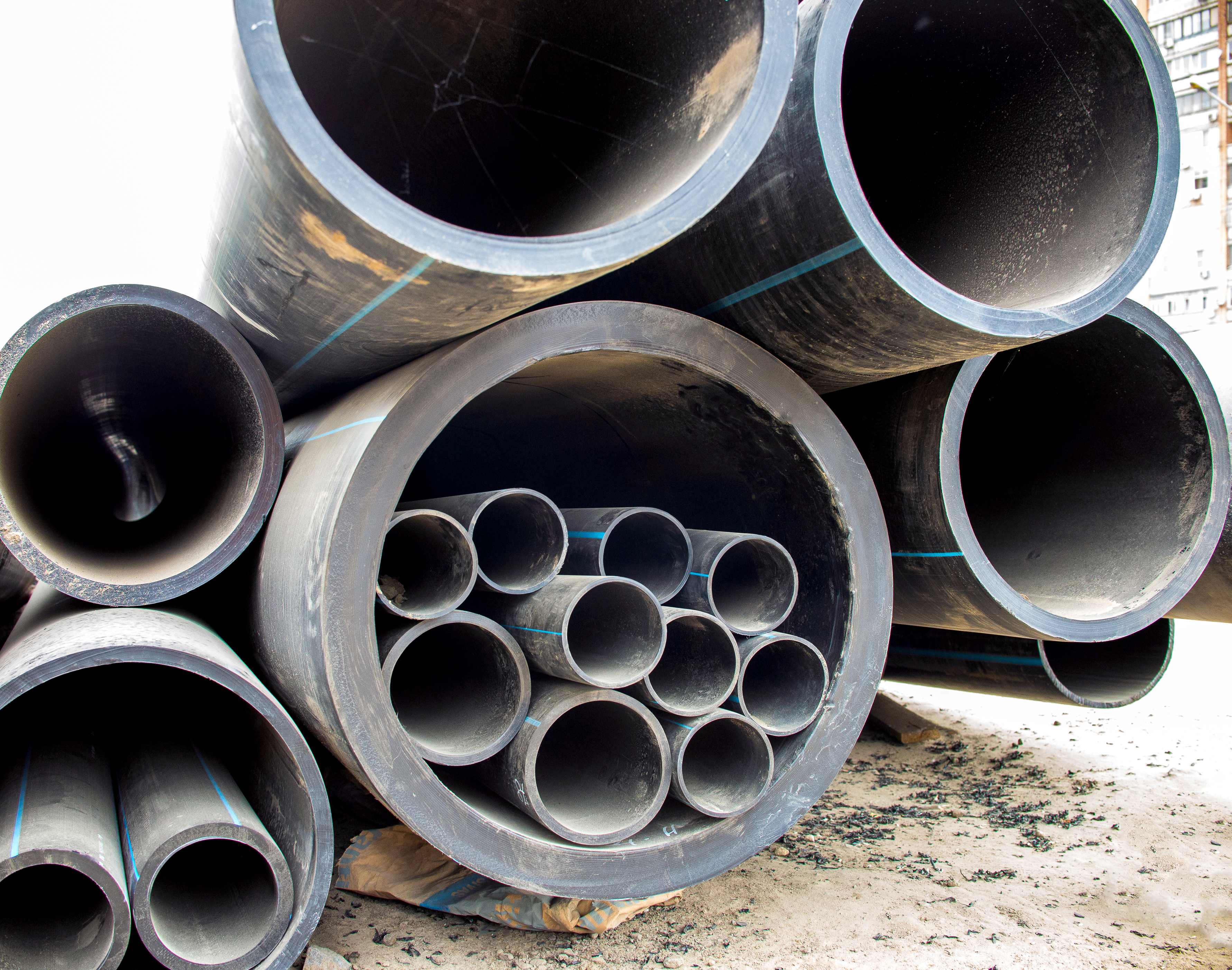 На фотографии представлен внушительный штабель черных пластиковых труб, являющийся неотъемлемой частью современной строительной индустрии и инфраструктурных проектов. Композиция акцентирует внимание на их количестве и организованности, создавая впечатление надежности и готовности к использованию. Фон размыт, что позволяет зрителю сконцентрироваться исключительно на деталях самих труб – их поверхности, текстуре и характерным голубым полосам, которые не только служат визуальным элементом, но и могут указывать на определенные стандарты или спецификации материала. Освещение равномерное, без резких теней, что подчеркивает гладкую поверхность пластика и позволяет детально рассмотреть структуру материала. Время суток определить сложно, судя по нейтральному освещению, это может быть как дневное время, так и хорошо освещенный складской комплекс. В целом, изображение создает ощущение масштабности проектов, в которых используются эти трубы, и подчеркивает их важность для современной цивилизации.