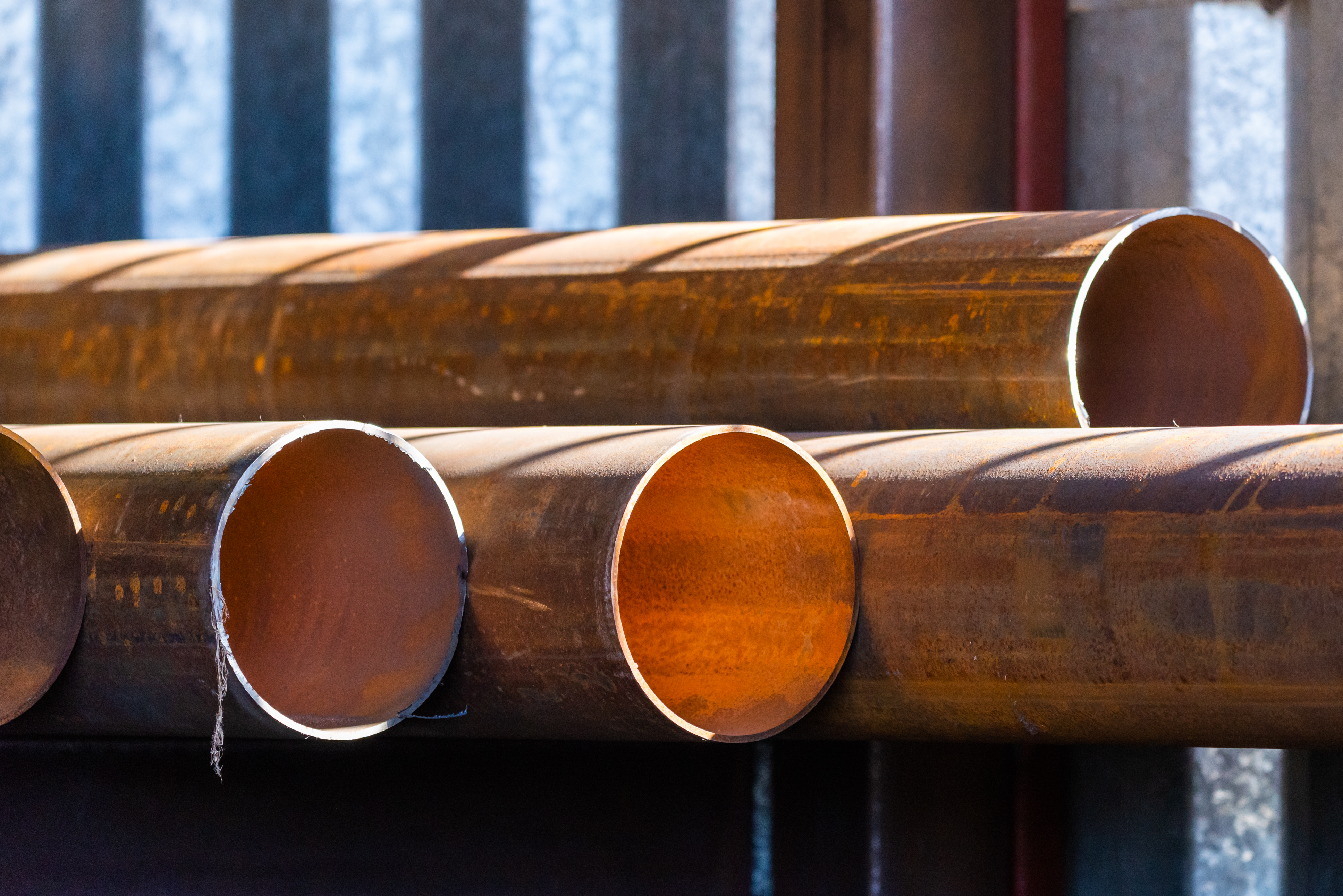 Before us is a monumental industrial scene depicting an impressive stack of cylindrical round steel pipes. It seems the action takes place on the territory of a metallurgical plant or a large logistics center where industrial materials are processed and stored. The enormous pipes, stacked in neat rows, create a sense of power and organization. Light falls from above, emphasizing the geometric precision of their arrangement and the scale of the warehouse. Judging by the time of day it’s daytime, the sky is veiled with a light haze, which adds a touch of mystery and an industrial aura to the scene. In the distance, you can make out the silhouettes of industrial buildings, confirming the location as an industrial zone, and the absence of people in the frame only enhances the sense of scale and lifelessness of this industrial landscape, emphasizing its functionality and practicality.