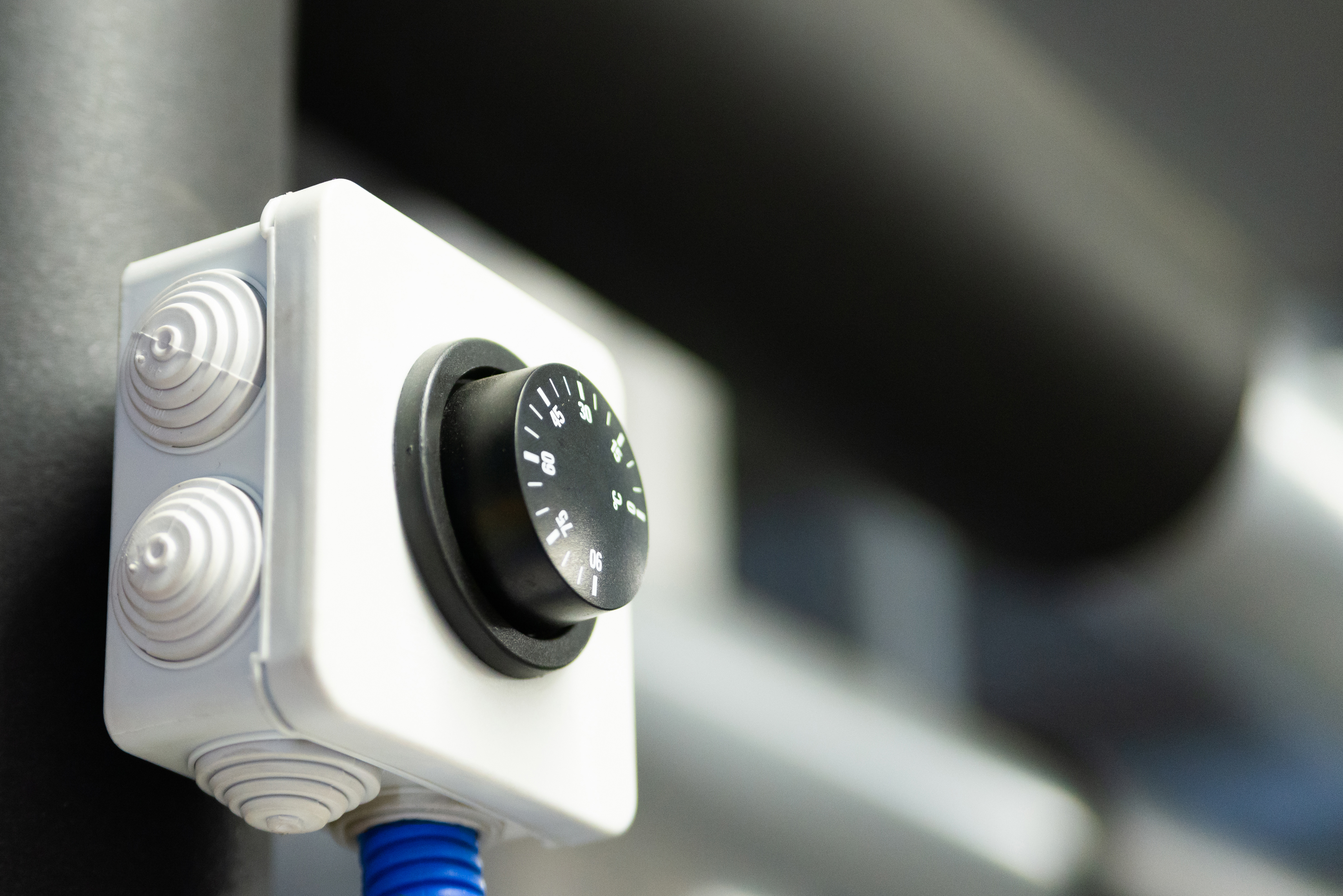 The photograph presents a close-up of a modern thermostat, playing a key role in maintaining stable temperatures in industrial or domestic systems. The camera focuses on the white body of the device, elegantly contrasting with the black dial, which is the primary control mechanism. The thermostat is securely mounted directly onto pipes, emphasizing its functionality and direct connection to the heating or cooling system. The surrounding background is intentionally blurred, focusing attention solely on the thermostat itself and the details of its construction, creating a sense of focus and professionalism. Overall, the image conveys an atmosphere of precision, reliability, and technological advancement characteristic of modern climate control systems. The context of use implies both industrial facilities such as factories or laboratories and residential spaces where the thermostat ensures comfortable temperatures throughout the year.