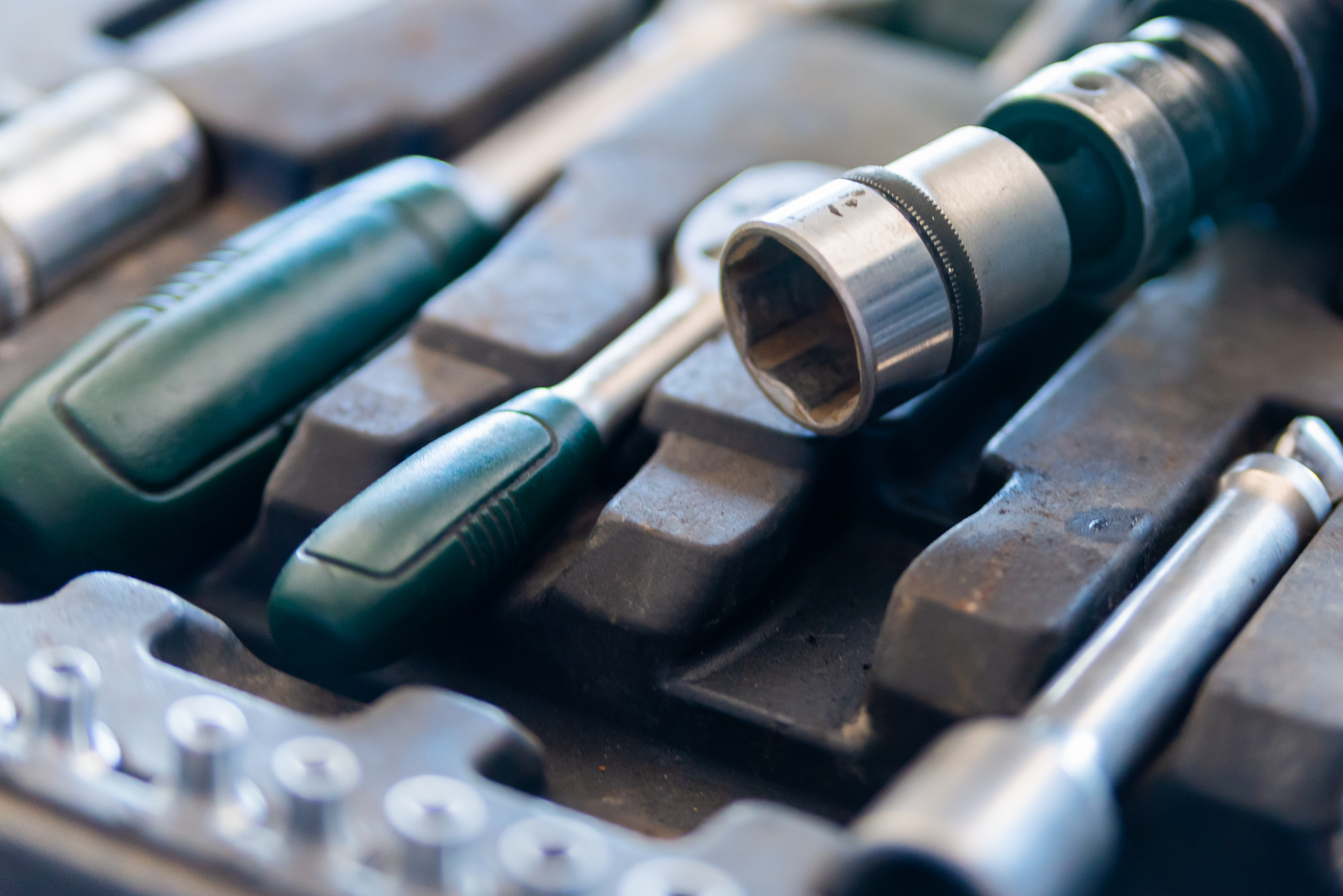 The overall atmosphere of the image is one of practicality, reliability, and professionalism. It feels as though the toolbox has just been opened to tackle an important task. The color scheme is muted, with dominant shades of gray, black, and green, creating a feeling of calmness and confidence. The image is perfect for use in contexts related to repair, construction, automotive themes, or as a symbol of craftsmanship.