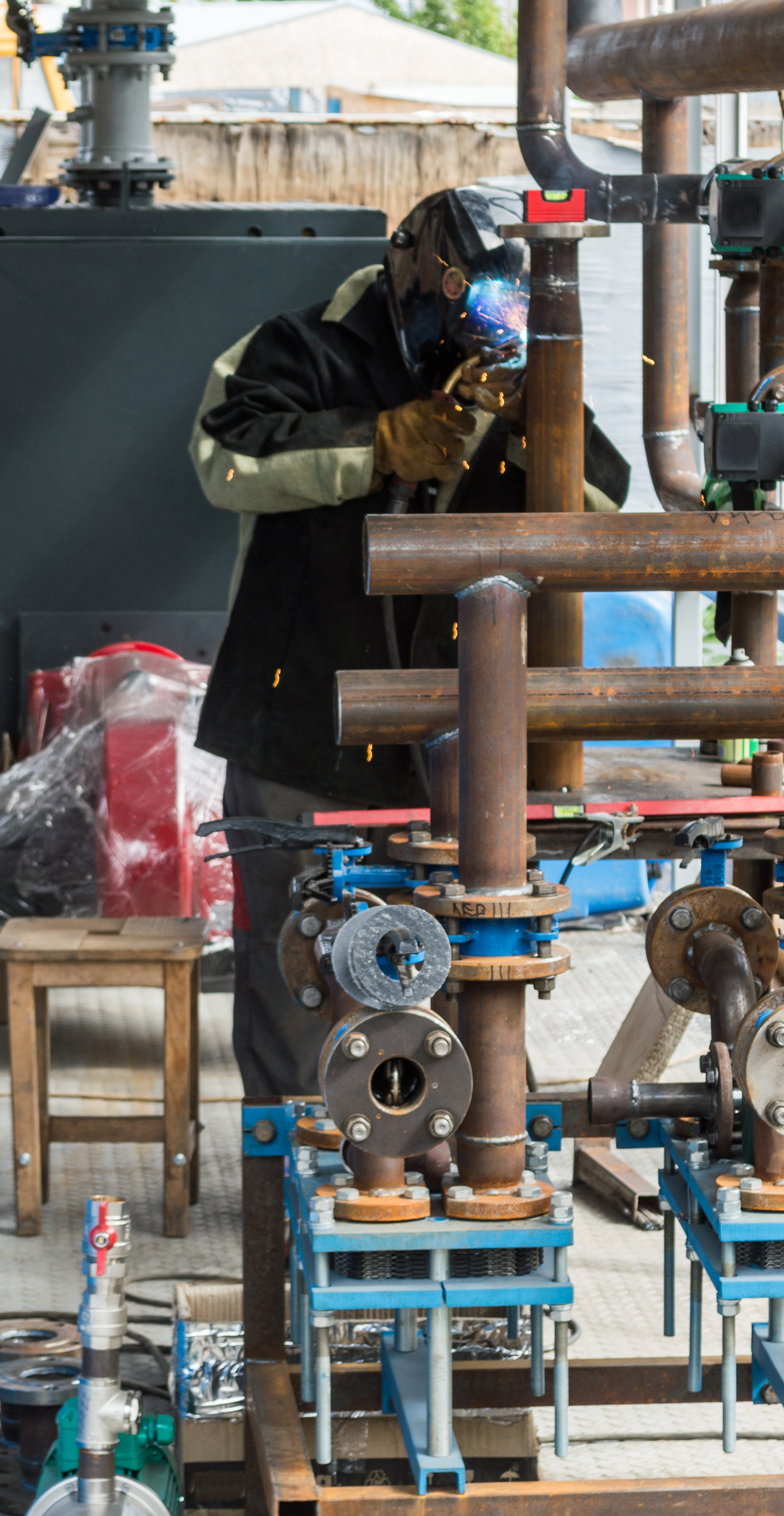 Фотография запечатлела напряженный момент работы квалифицированного сварщика, который сосредоточенно выполняет свою задачу по созданию надежного соединения в сложной промышленной системе трубопроводов. Рабочий, одетый в плотную защитную одежду и перчатки, стоит перед конструкцией из металлических труб, на его лице — сварочная маска, скрывающая взгляд, но не мешающая точности движений.