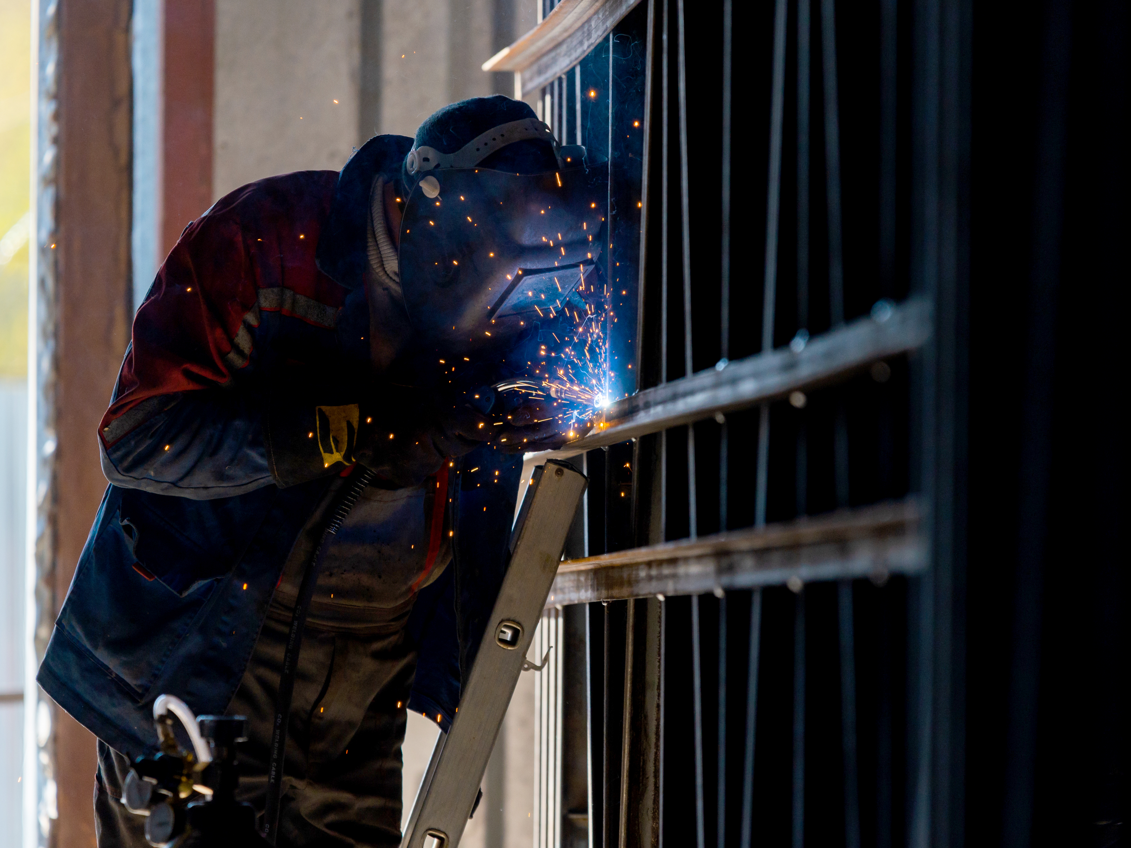 В центре внимания – сам сварщик в полном комплекте защитной экипировки: огнеупорный костюм, перчатки, маска с затемненным стеклом. Именно маска позволяет разглядеть лишь часть лица, подчеркивая анонимность и сосредоточенность рабочего. Металлическая конструкция занимает большую часть кадра, представляя собой сложную решетку с множеством переплетений. Яркие искры, вырывающиеся из-под сварочного аппарата, создают эффектную динамическую композицию. Они контрастируют с темным фоном и блестящей поверхностью металла, привлекая взгляд зрителя. Освещение неравномерное: основная часть конструкции находится в полутени, что подчеркивает рельеф и фактуру металла, а зона сварки залита ярким светом от искр.