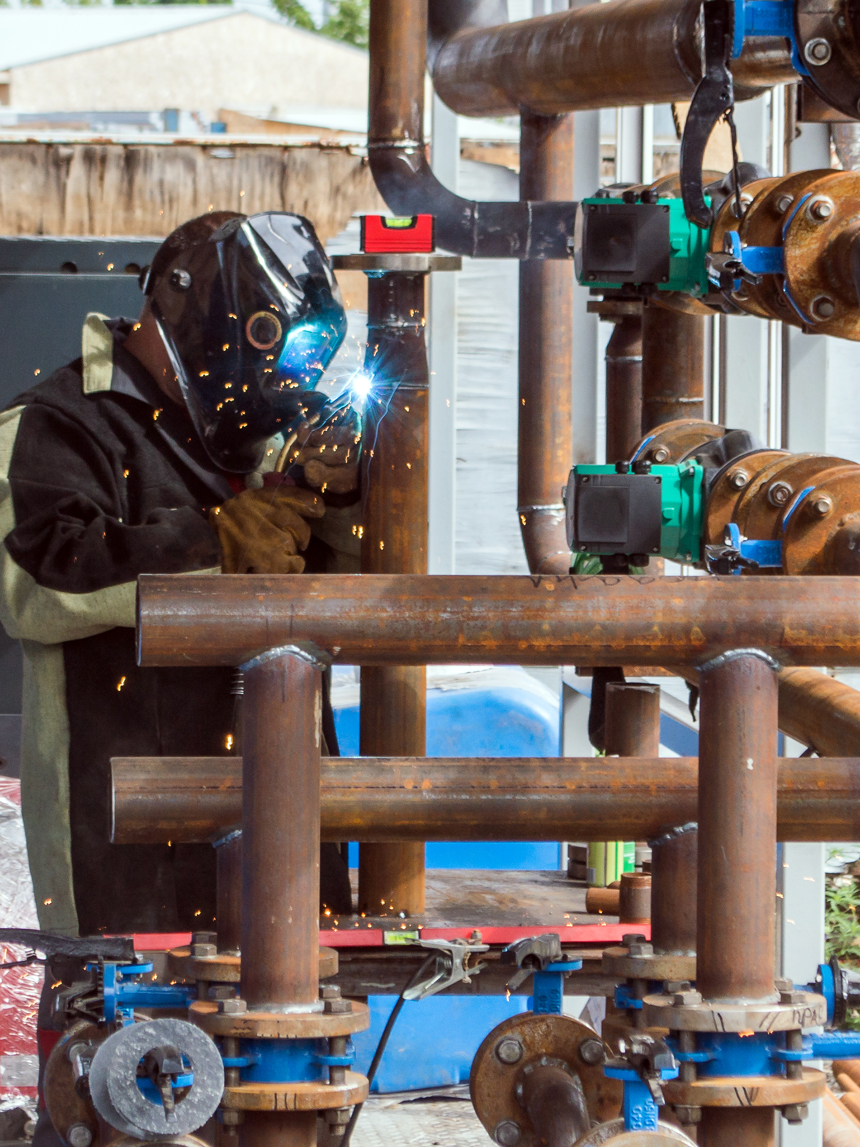 In the foreground, we see a complex piping system, some parts of which have a rusty patina, indicating their use or exposure to external elements. A red level is visible on one of the pipes, likely used for precise alignment of parts before welding, emphasizing the importance of accuracy in this task. The pipes are connected using flanges and valves, some of which are painted a bright blue, contrasting with the dark metallic tones.