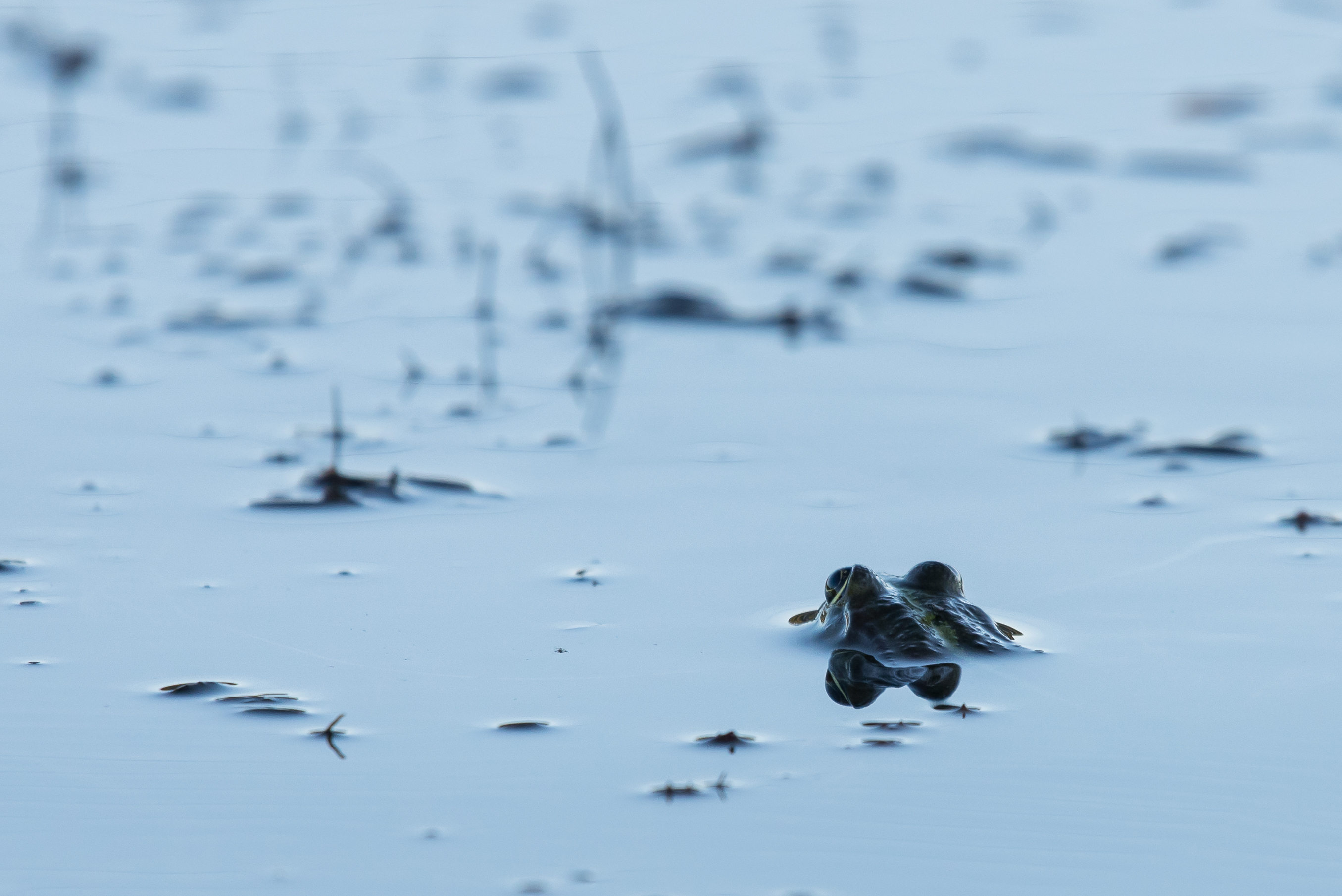 The atmosphere of the photograph is imbued with a sense of peace and serenity. The gaze lingers on the details of the frog’s head, evoking a feeling of admiration for the beauty and perfection of nature. The image evokes pleasant emotions—calmness, contemplation, and a desire to be alone with nature. Stylistically, the photograph can be classified as natural or macro photography, focusing attention on the details of the surrounding world. Masterful use of background blurring creates an effect of depth of field, which focuses all viewer attention on the main subject—the frog—making it the center of attention and creating a sense of immersion in this quiet, peaceful world.