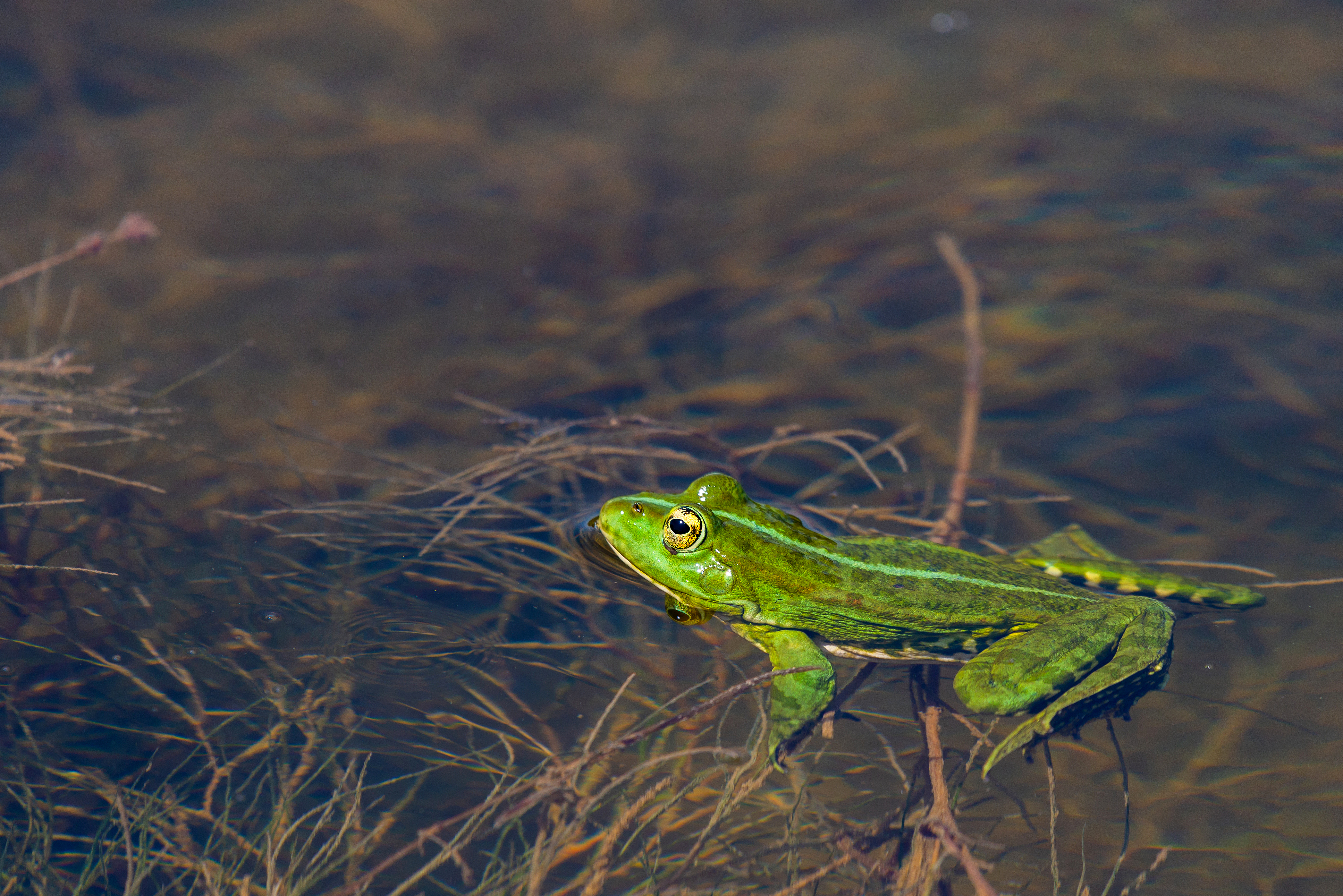 Композиция снимка построена таким образом, чтобы лягушка была главным объектом внимания. Она расположена немного смещено от центра, создавая динамику и интерес для зрителя. Трава и ветки на переднем плане добавляют глубины изображению и подчеркивают естественность сцены. На заднем плане видна темная водная гладь, отражающая небо и окружающие деревья. Игра света и тени создает контраст между светлой лягушкой и темным фоном.