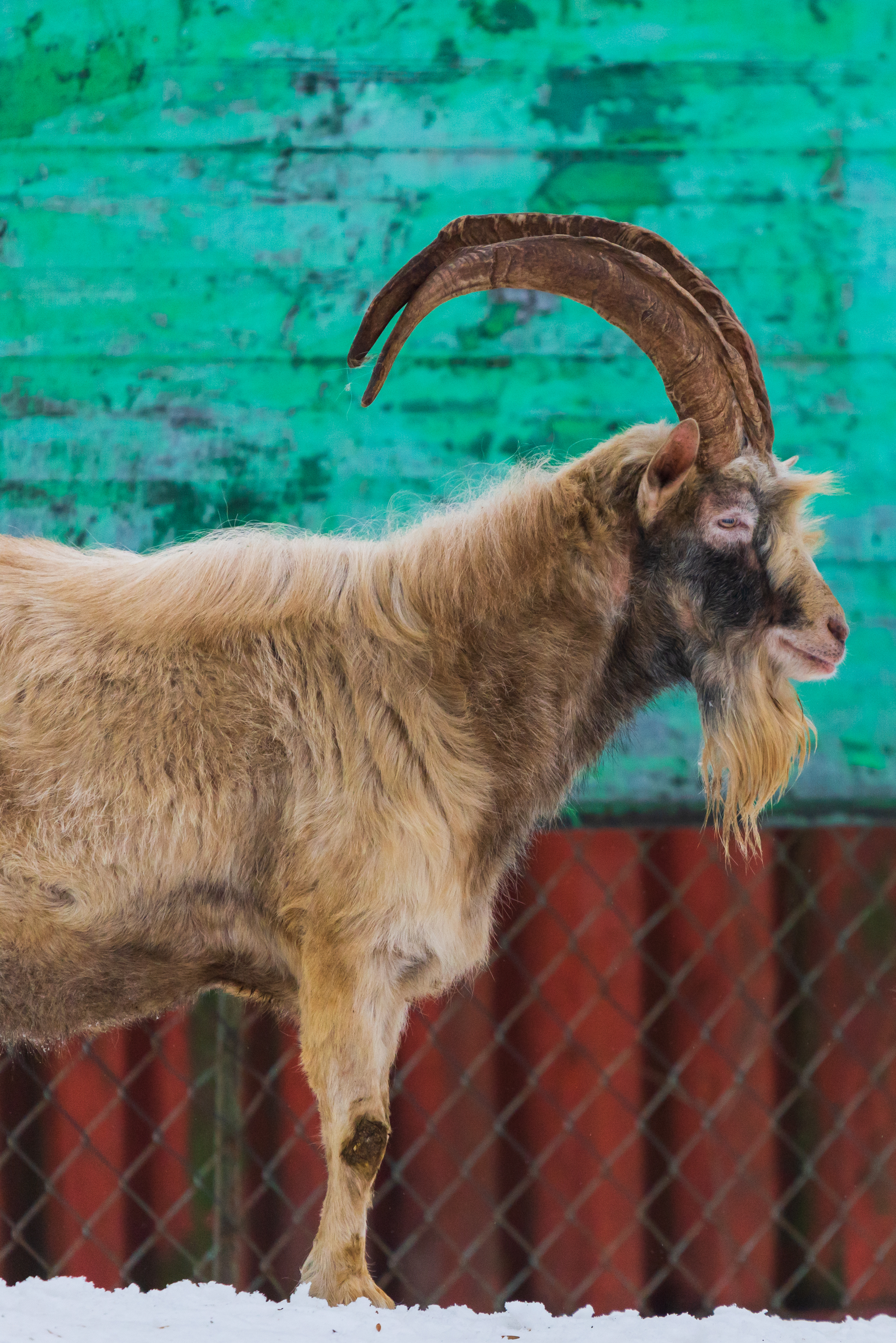 The center of the composition is the profile of the goat, which allows you to carefully examine his impressive horns, which are the dominant element of the image. The horns are massive, twisted, covered with a thin layer of snow, which adds even more monumentality to them. The goat's fur is thick and warm, protecting him from the winter cold. Its texture is rough, with visible hairs, emphasizing its natural origin. A vibrant green fence in the background creates a sharp contrast with the snowy backdrop, drawing attention to the figure of the goat and adding dynamism to the composition. The lighting is even, diffused, without harsh shadows, which makes the image soft and harmonious. The color palette consists of white, green and brown colors, which create a pleasant visual atmosphere.