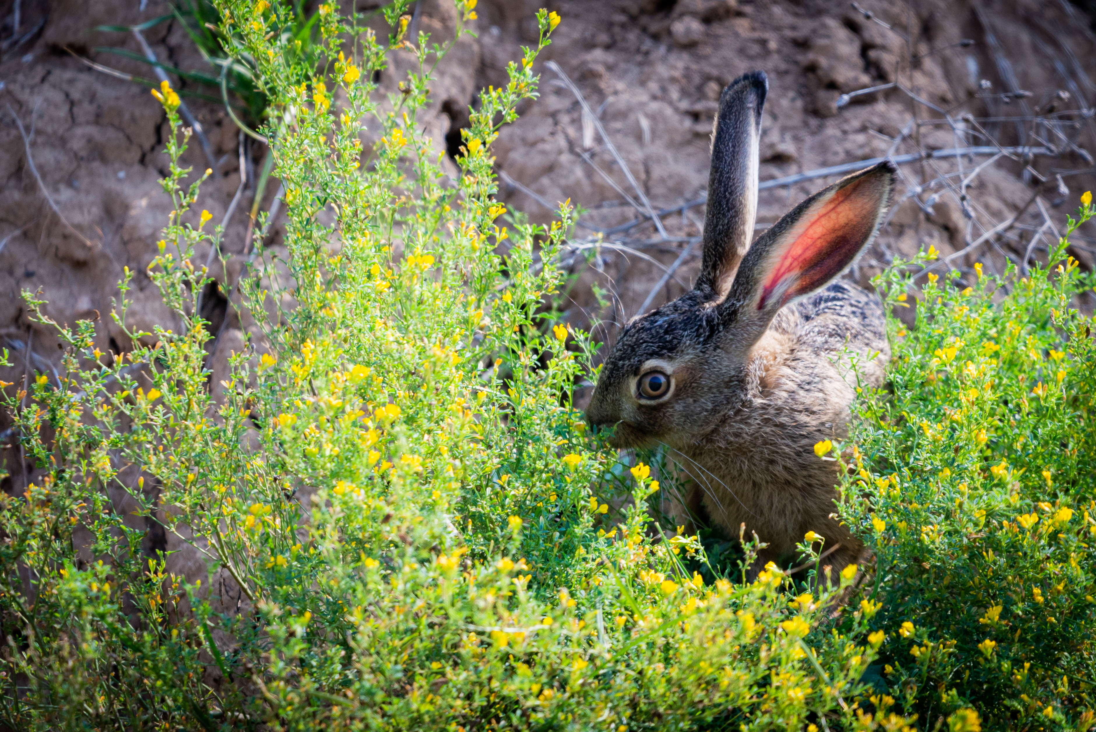 The photograph depicts a young hare concealed within dense wild grass. Vibrant yellow flowers contrast with the greenery and brownish fur of the hare, creating a picturesque scene of wildlife. The ground beneath is dry and cracked, suggesting an arid climate or season. The hare attentively gazes into the camera, its long ears perked up cautiously, and its eyes filled with curiosity. The composition of the frame is arranged to emphasize the naturalness and simplicity of the scene, leaving the viewer with a sense of peace and connection to nature.