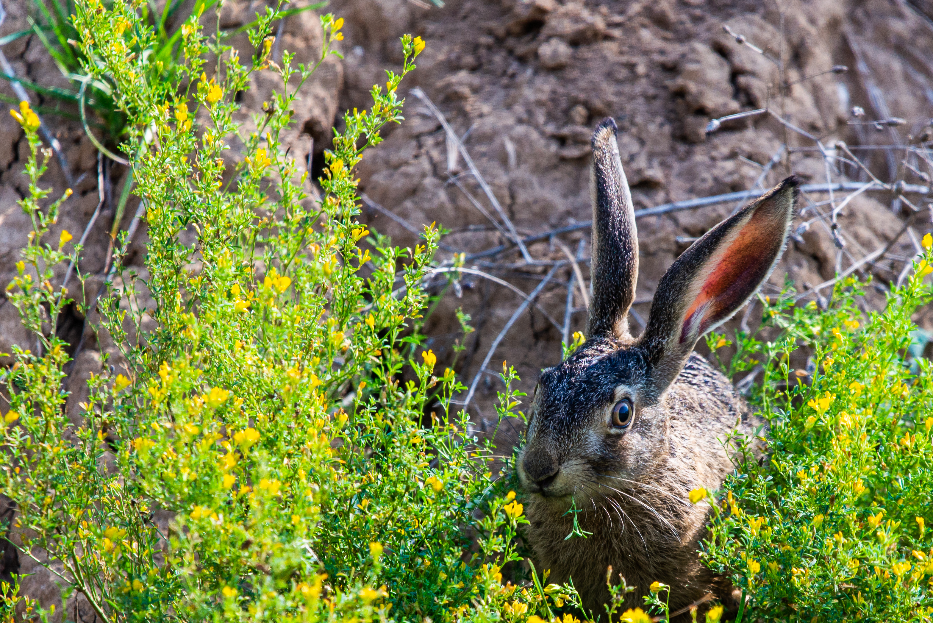 The photograph captures a charming moment from the world of wildlife: a young hare has taken shelter in a dense thicket of bright yellow flowers. It seems to be seeking coolness and protection from the sun's rays, hiding among the stems and petals. The setting is a typical meadow or lowland field, possibly in spring or summer when nature is at its peak bloom. Soft sunlight illuminates the scene, creating a feeling of warmth and comfort. The hare looks completely serene, despite being in an open space – its sensitive nose twitches constantly, and its large eyes curiously examine the surroundings, as if collecting information about every movement nearby. This is a wonderful example of harmony between the animal world and the environment, demonstrating the beauty of wildlife in its natural state.
