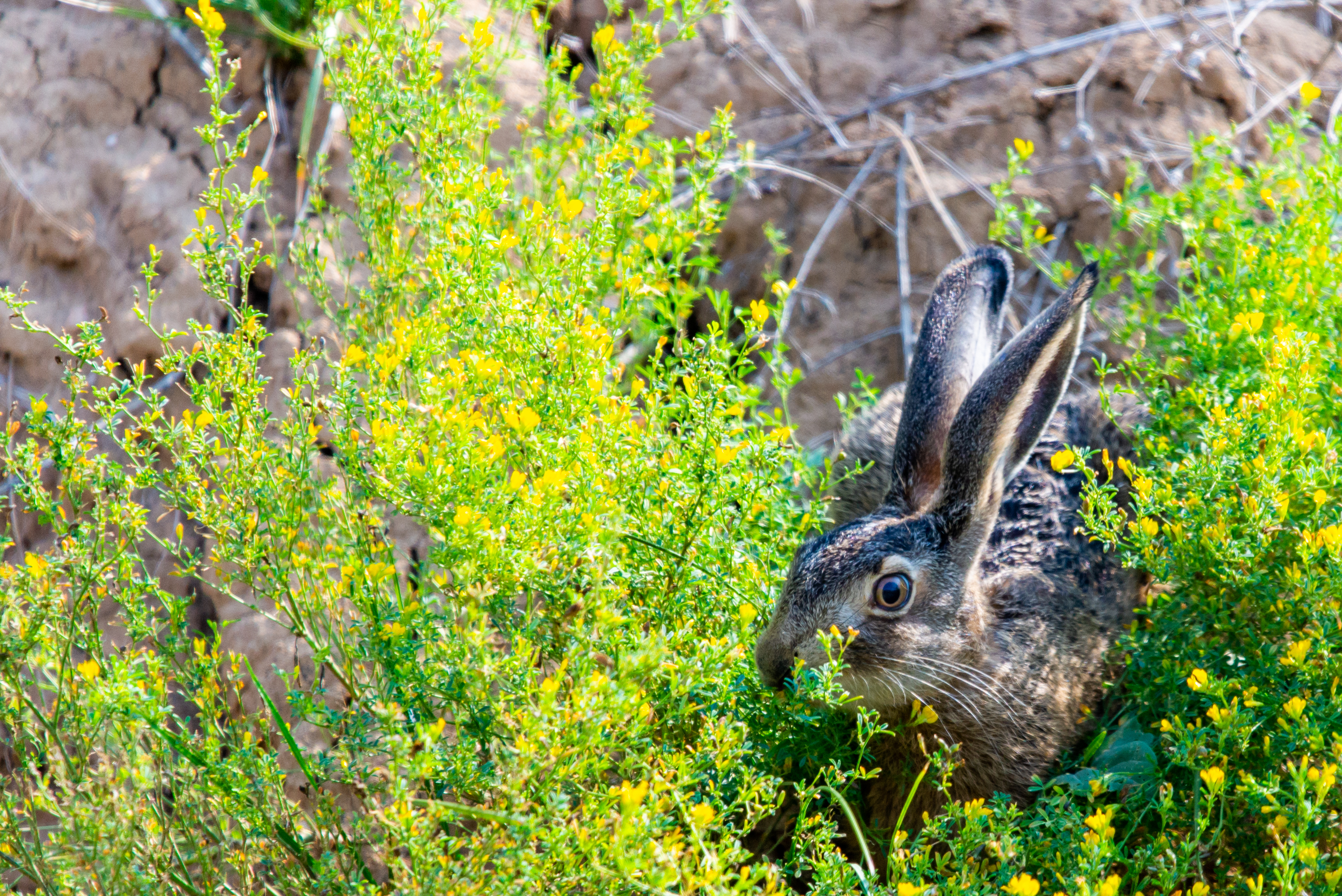 The photograph captures a young hare sitting amidst a dense thicket of yellow flowers against an earthy soil and rocky background. It appears as though it has just emerged from its burrow or is hiding from predators. Sunlight gently illuminates the scene, creating a feeling of warmth and tranquility. The green stems of grass and vibrant yellow flowers add a cheerful look to the image, while the dark background highlights the standout hare.