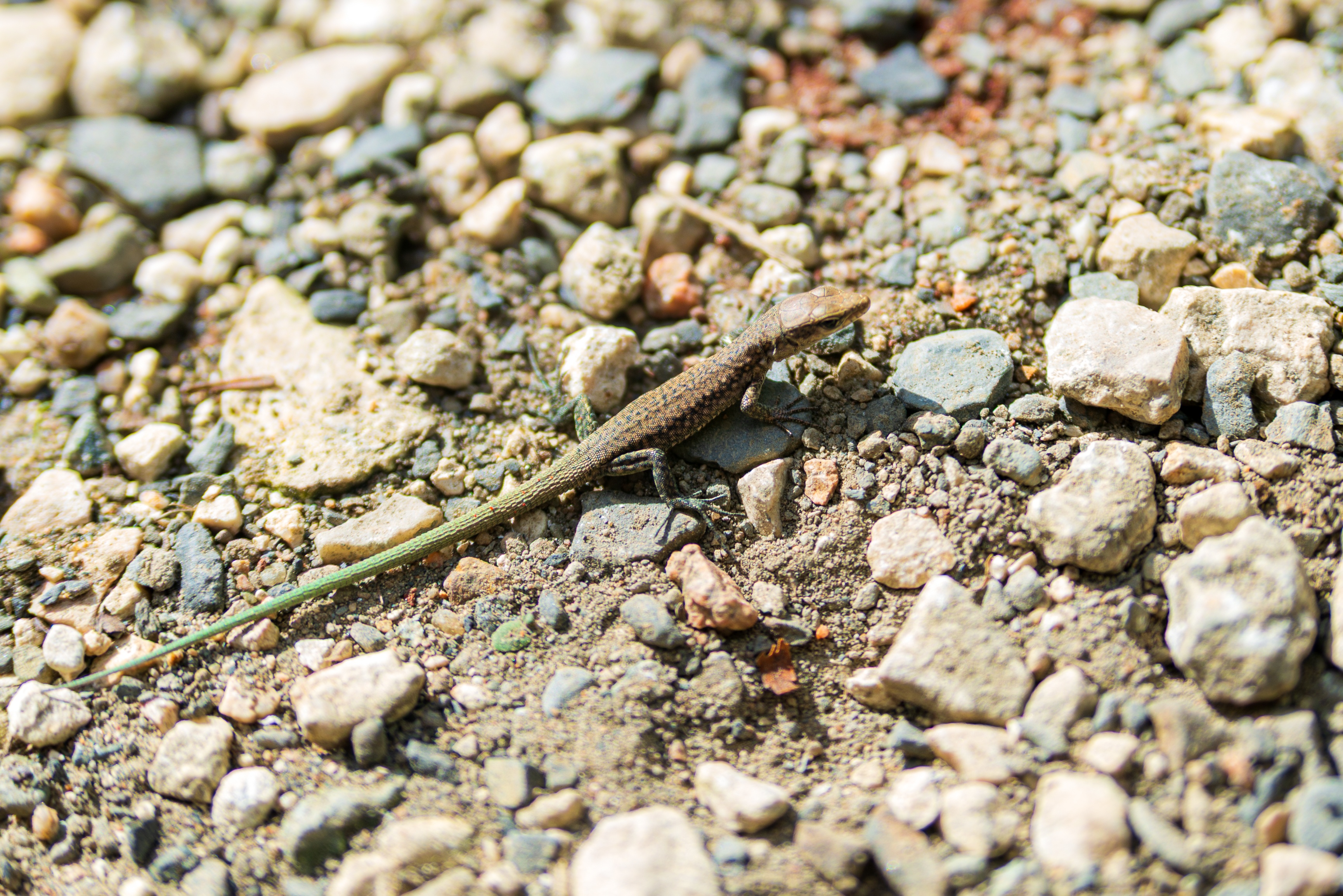 На снимке запечатлена ящерица, находящаяся на каменистом грунте под прямым солнечным светом. Сцена происходит в дневное время, когда интенсивность освещения позволяет четко видеть текстуру кожи животного и разнообразие оттенков камней. Композиция кадра сфокусирована на ящерице, которая расположена диагонально, создавая ощущение движения и естественности. Фон слегка размыт, что позволяет акцентировать внимание на главном объекте. Детализация достигнута благодаря использованию макрофотографии, позволяющей увидеть каждую чешуйку и шершавость поверхности. Визуально снимок передает ощущение тепла, природной гармонии и спокойствия. Настроение изображения — умиротворяющее и живописное, идеально подходит для использования в образовательных или экологических проектах. Снимок может служить иллюстрацией для статей о фауне, природе или путешествиях.