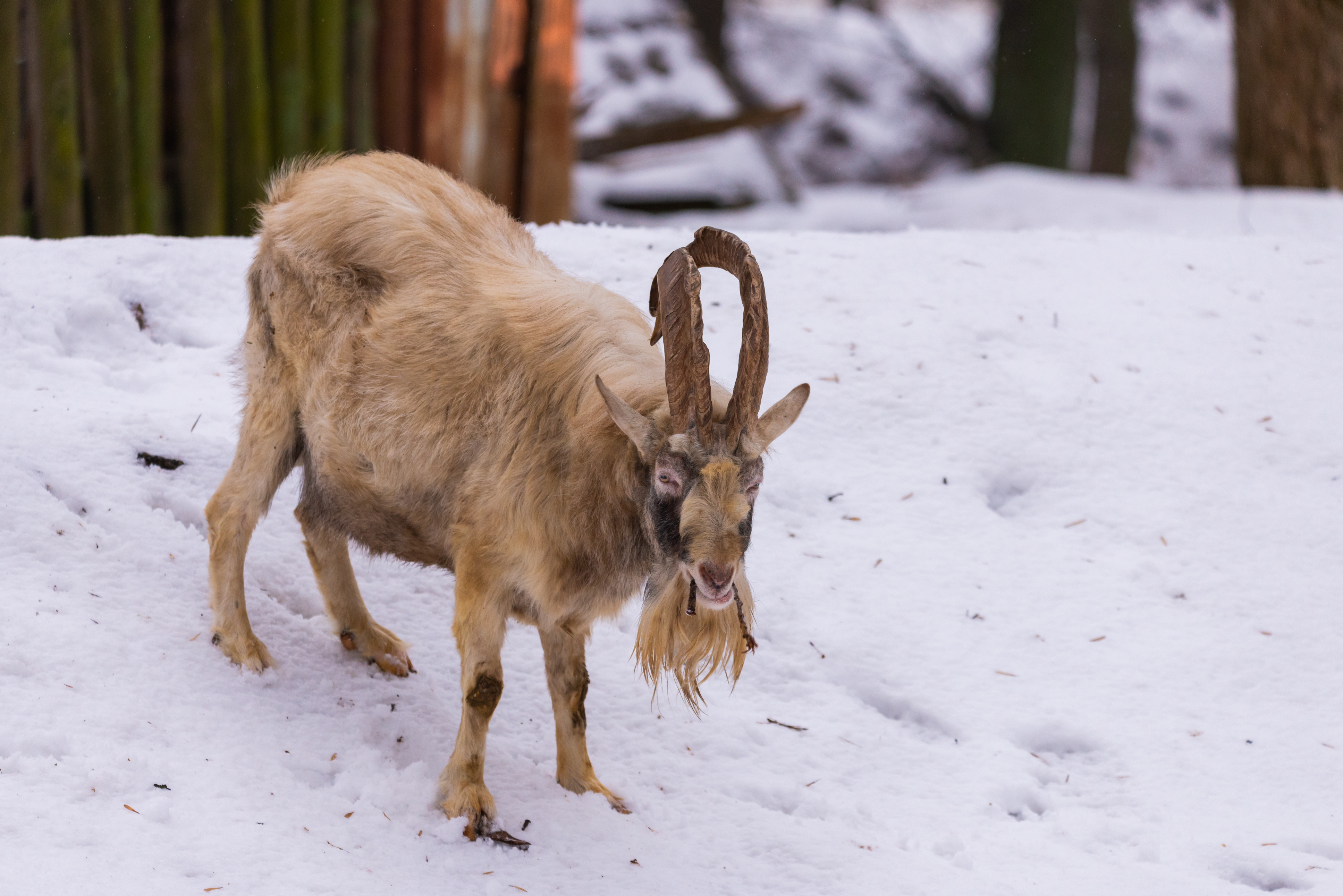 The center of the frame is a proud goat, whose mighty figure stands out against the monochrome snowy background. Its fur has a natural, slightly reddish hue that harmonizes with the surrounding landscape. Large, twisted horns are a distinctive feature of this species and add to its grandeur. The goat stands on four sturdy legs, confidently holding onto the slippery snow surface. There's calmness and awareness of its strength in its eyes. The lighting is soft, diffused, which emphasizes the texture of the goat’s fur and creates a sense of volume. The snow sparkles under the sun's rays, creating a play of light and shadow across the entire frame. The texture of the snow looks fluffy and delicate, while the stones peeking out from beneath it – cold and hard.