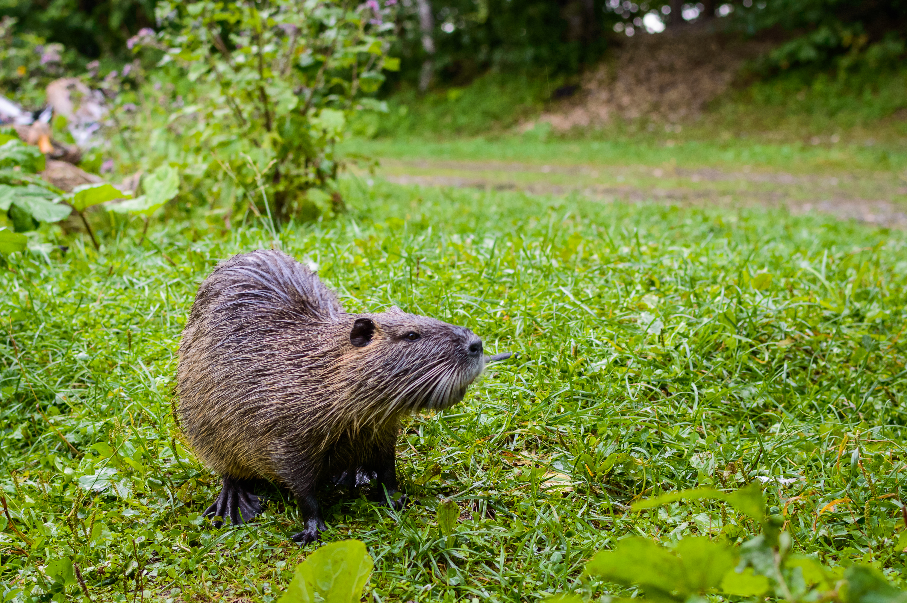 Задний план изображения размыт, создавая эффект боке, который фокусирует все внимание на животном. Видно зеленую растительность, кусты и деревья, а также намек на грунтовой путь, уходящий вдаль. Это создает ощущение естественной среды обитания, где нутрия чувствует себя в безопасности. Цветовая гамма изображения преимущественно зеленая, с оттенками коричневого у животного, что создает спокойную и умиротворяющую атмосферу.