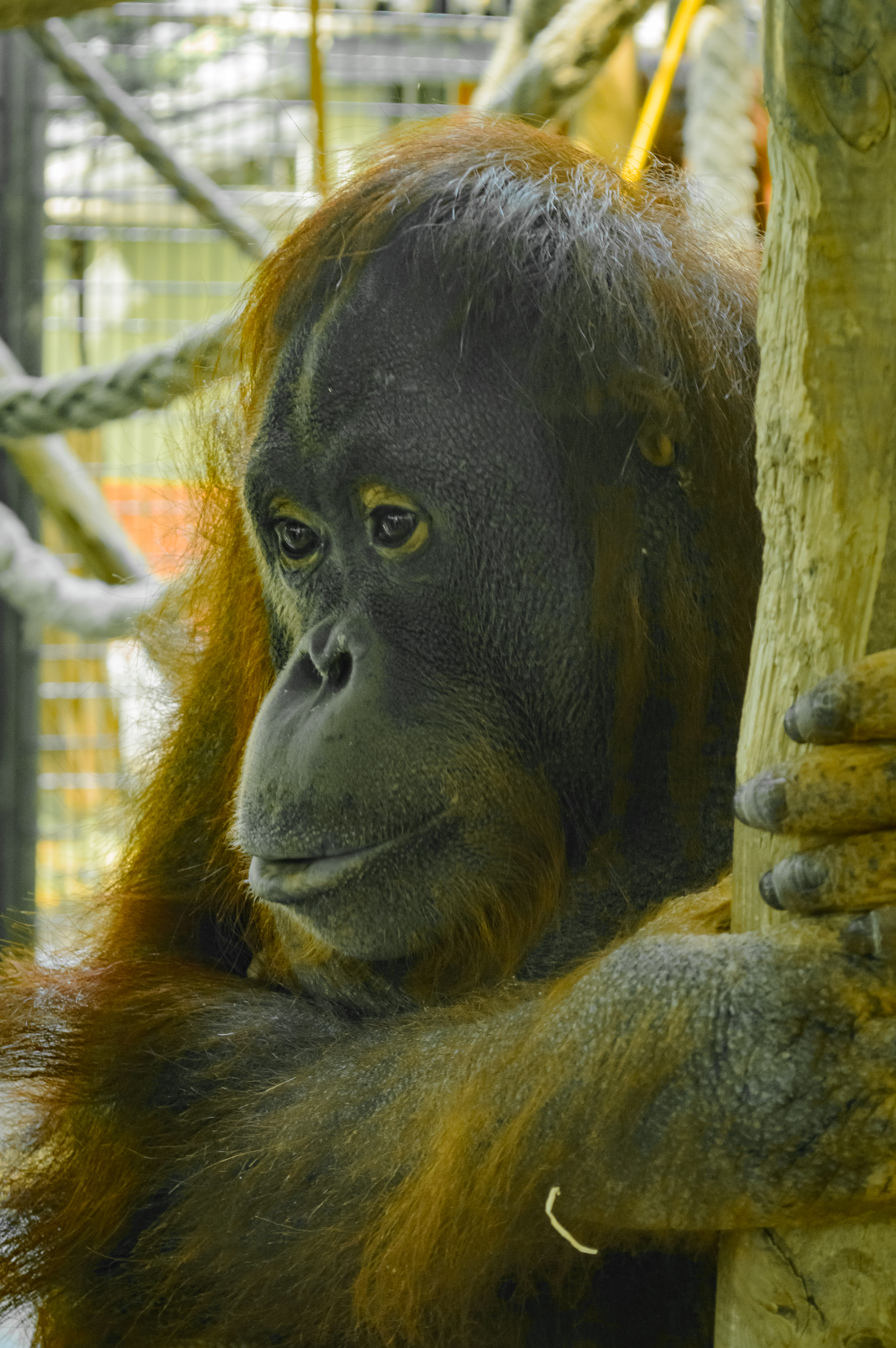 Orangutan portrait in a zoo: thoughtful gaze and fluffy fur