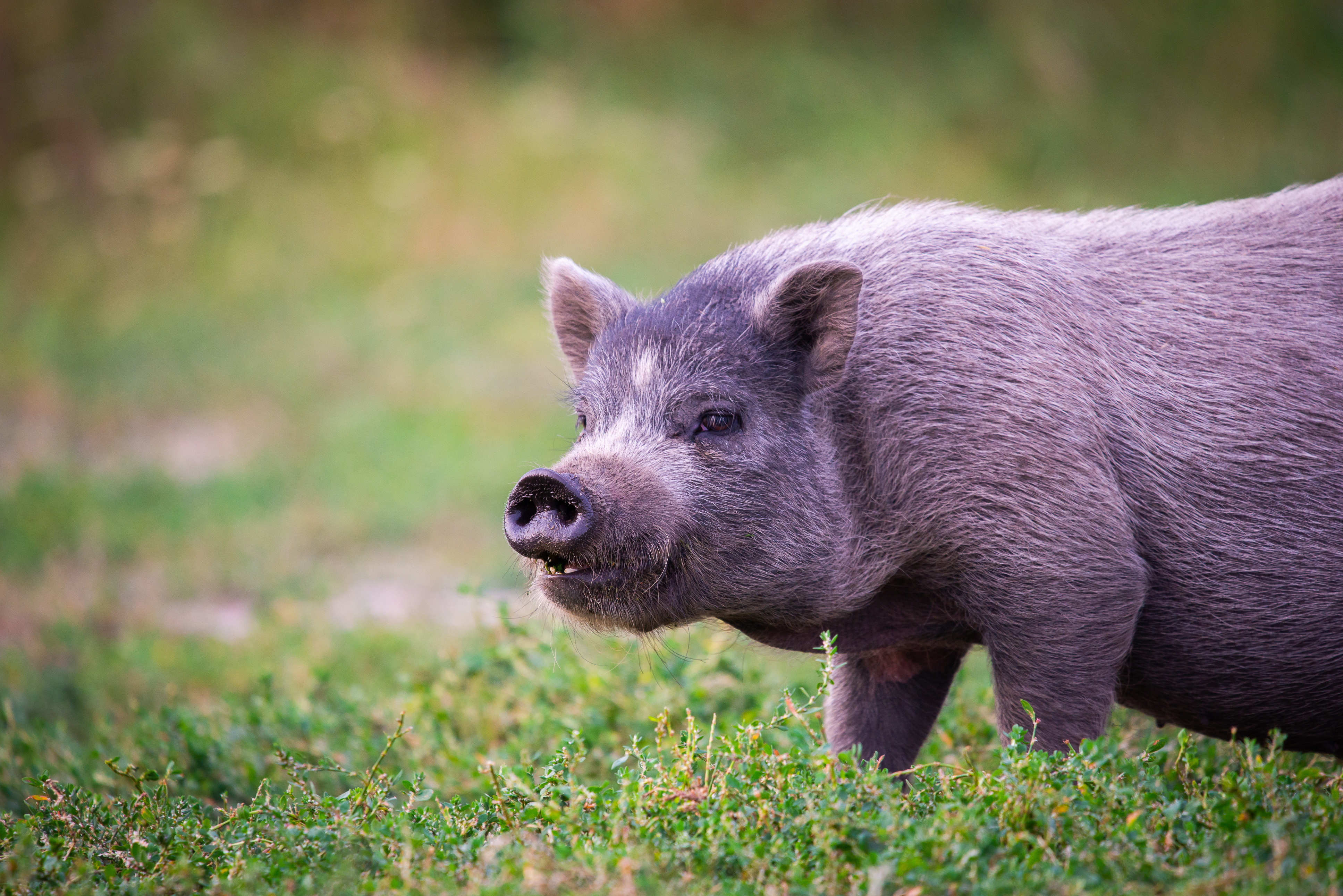 Яркое летнее утро заливает солнечным светом просторное поле, усыпанное сочной зеленой травой и разноцветными полевыми цветами. В центре композиции – очаровательная породистая свинья, чья шерсть отливает оттенками серого, создавая мягкий и пушистый эффект. Она стоит спокойно и уверенно, словно наслаждаясь теплым ветерком и окружающим пейзажем. Вокруг нее простирается бескрайнее зеленое пространство, которое создает ощущение свободы и спокойствия. Кажется, что время замерло в этом уголке природы, где царит мир и гармония. Небо над полем слегка размыто, что добавляет снимку мечтательности и подчеркивает основную тему – очарование животного мира и красоту естественной среды обитания. Этот снимок - ода простоте и природной красоте, воплощенная в образе грациозного животного на фоне залитого солнцем луга.