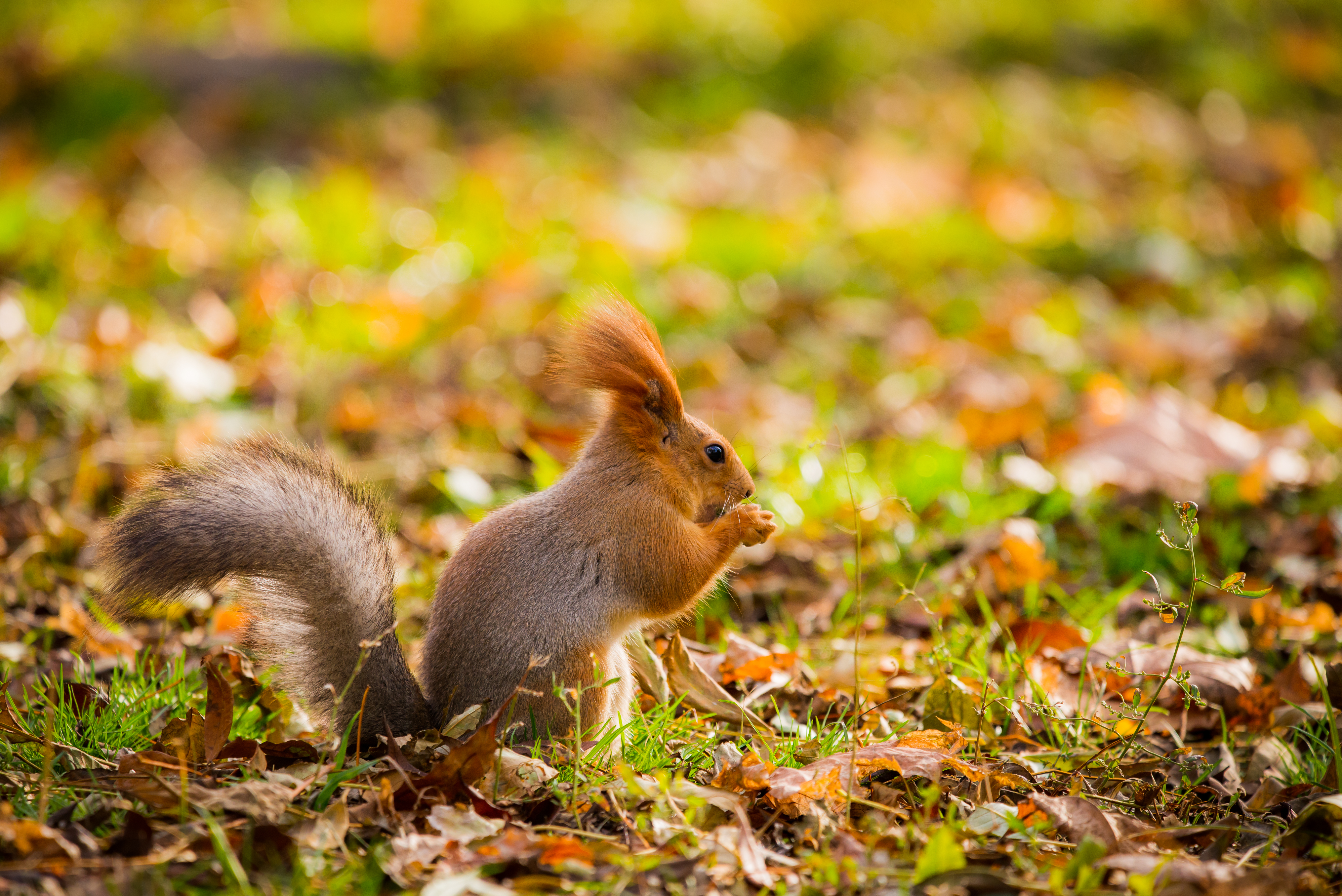Осенний день дарит нам удивительный момент созерцания: рыжая белка, словно маленькое яркое пламя среди бурого леса, занята своим повседневным делом – лакомым орешком. Кадр запечатлен в самом сердце осеннего парка или сквера, где под ногами у белки ковер из пожухлой травы и пестрой мозаики опавших листьев. Солнечный свет пробивается сквозь кроны деревьев, окрашивая окружающий пейзаж в теплые тона охры, золота и багрянца. Время словно замерло, позволяя нам насладиться этой тихой, умиротворенной сценой, полной естественной красоты и очарования дикой природы. Белка кажется абсолютно безмятежной, полностью поглощенной процессом поедания ореха, создавая ощущение спокойствия и гармонии с окружающим миром. Этот момент – маленькое чудо, которое хочется остановить и запомнить навсегда.