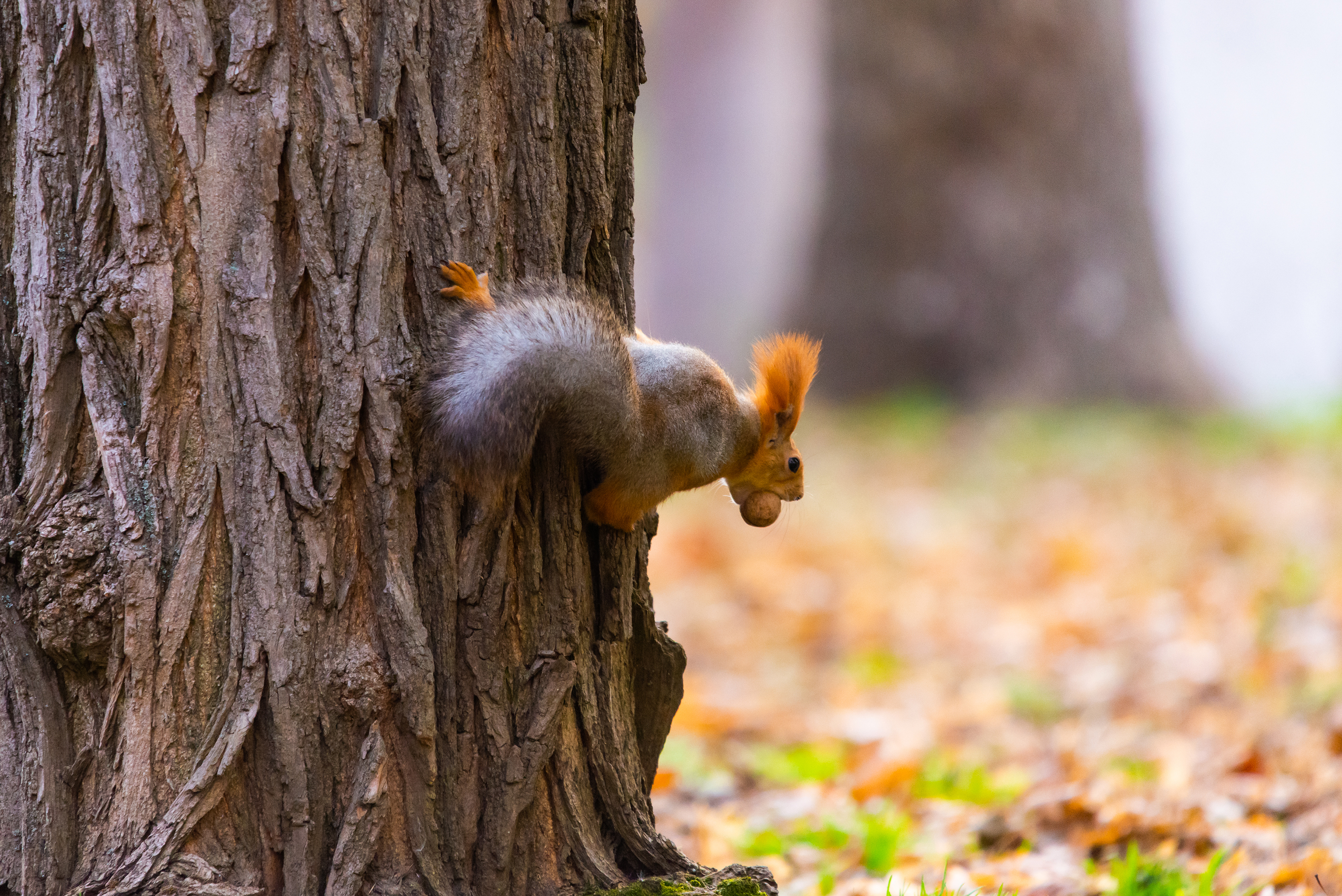 The center of the composition features the squirrel confidently holding a nut in its paws. Her fur shimmers with copper and reddish gold, reflecting sunlight. The texture of the tree bark is rough and textured, creating an interesting contrast with the softness of the animal's fur. The nut looks appetizing and invites you to examine the details of its shape and color. Lighting falls on the squirrel from above, emphasizing her outlines and giving the shot volume. Her gaze is directed forward, expressing caution and curiosity. The tail, fluffy and lush, serves as a visual anchor, adding dynamism to the static scene. The color palette consists of warm autumn shades: golden, reddish-brown, brown, and green, creating a feeling of warmth and comfort. The photographer skillfully used a shallow depth of field to highlight the squirrel against the blurred park.