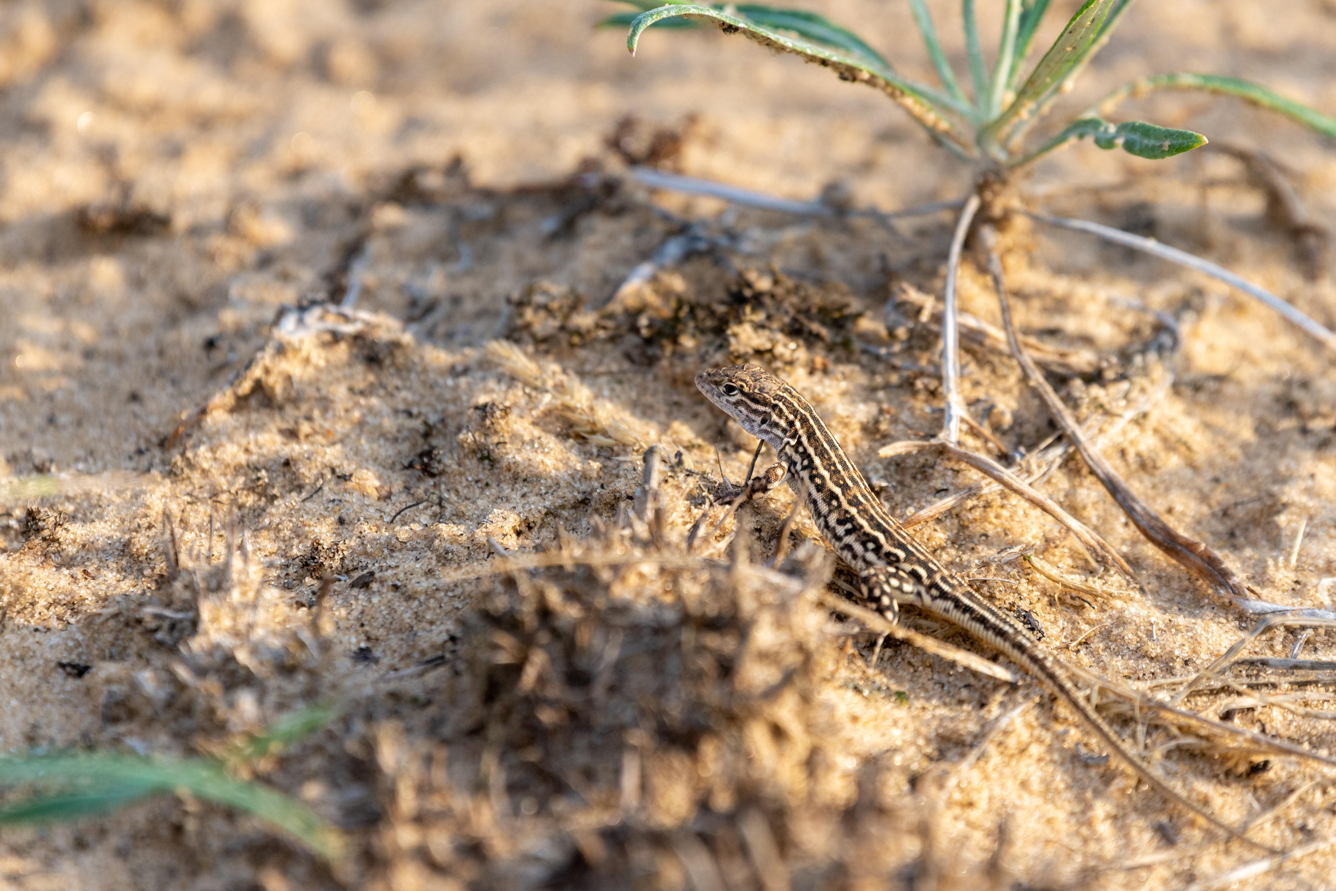 В центре внимания – самец прыткой ящерицы, демонстрирующий свою яркую окраску. Его тело покрыто чешуйками зеленого цвета с темными пятнами, которые помогают ему сливаться с окружающей средой и оставаться незамеченным для хищников. Мускулистые лапки крепко держатся за траву, готовые в любой момент сорваться с места и скрыться в укрытии. Глаза ящерицы – маленькие, но острые, внимательно осматривают окрестности в поисках потенциальной добычи или опасности. Композиция снимка выстроена таким образом, чтобы подчеркнуть естественную красоту животного и его гармонию с природой. Освещение мягкое и рассеянное, что позволяет выделить детали чешуи и текстуры кожи ящерицы без резких теней. В кадре присутствуют макро-детали: капли росы на траве, прожилки листьев, мельчайшие частички почвы, создающие ощущение полного погружения в мир дикой природы.