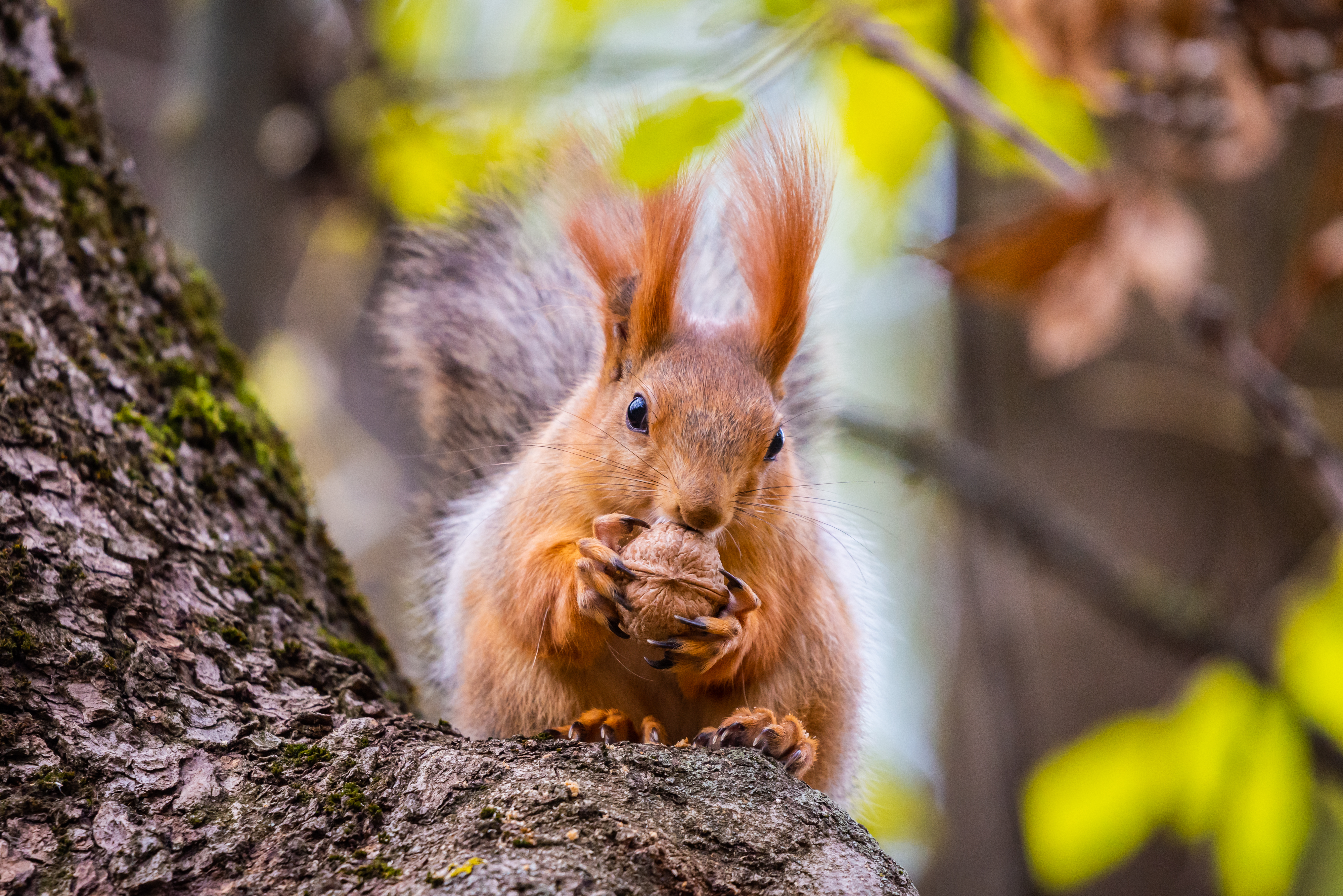 На фотографии запечатлен очаровательный момент из жизни рыжей белки, сидящей на корявой ветке старого дерева. Белка сосредоточена на своей добыче – сочном орехе, который она ловко удерживает в лапках. Листья на заднем плане намекают на осень, добавляя картине тепла и уюта. Окружающий пейзаж представляет собой смесь зелени и золотых оттенков, создавая гармоничную природную палитру. Крупный план позволяет рассмотреть каждую деталь: пушистый хвост белки, ее внимательные глаза и текстуру коры дерева.