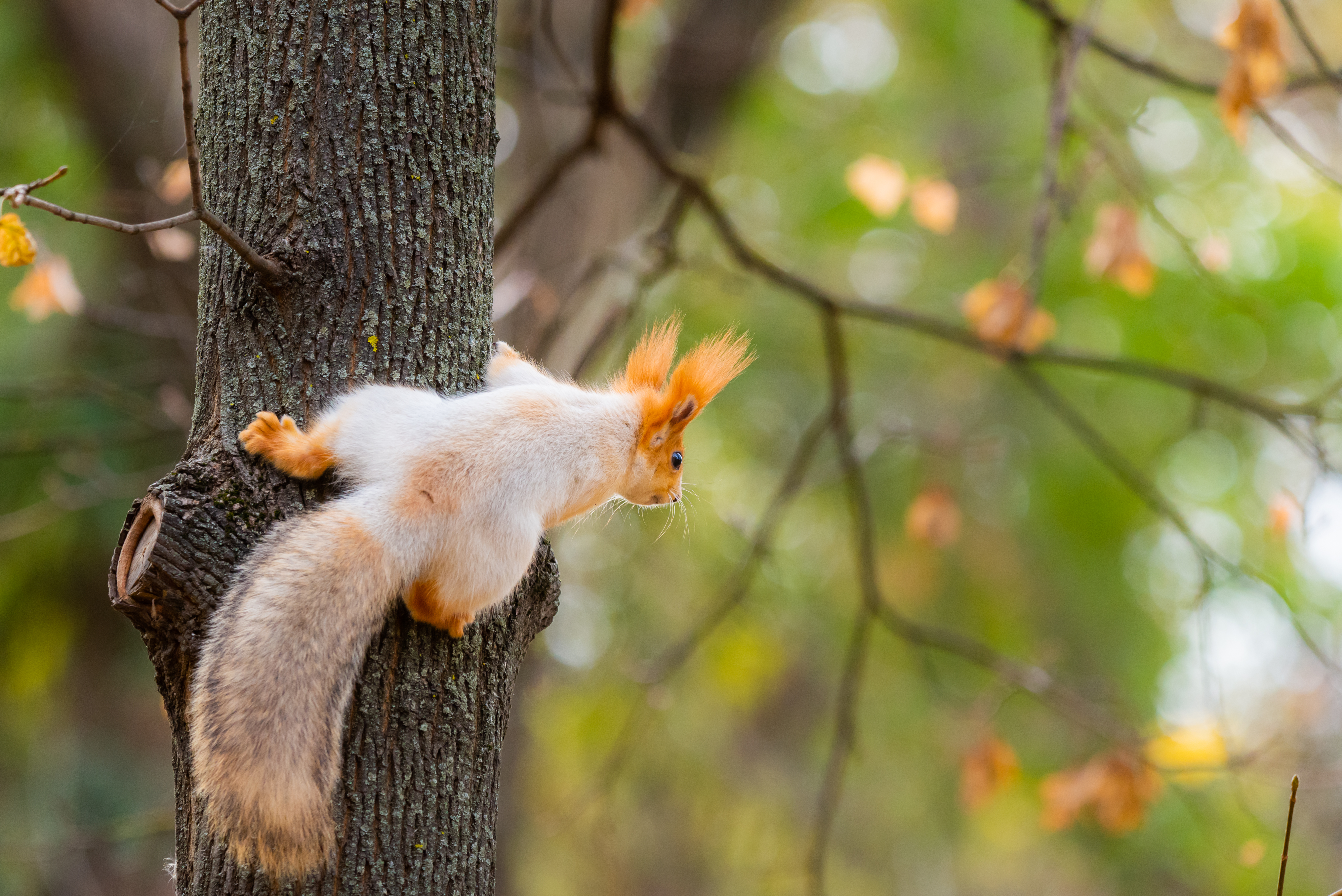 Squirrel with orange ears on tree in autumn