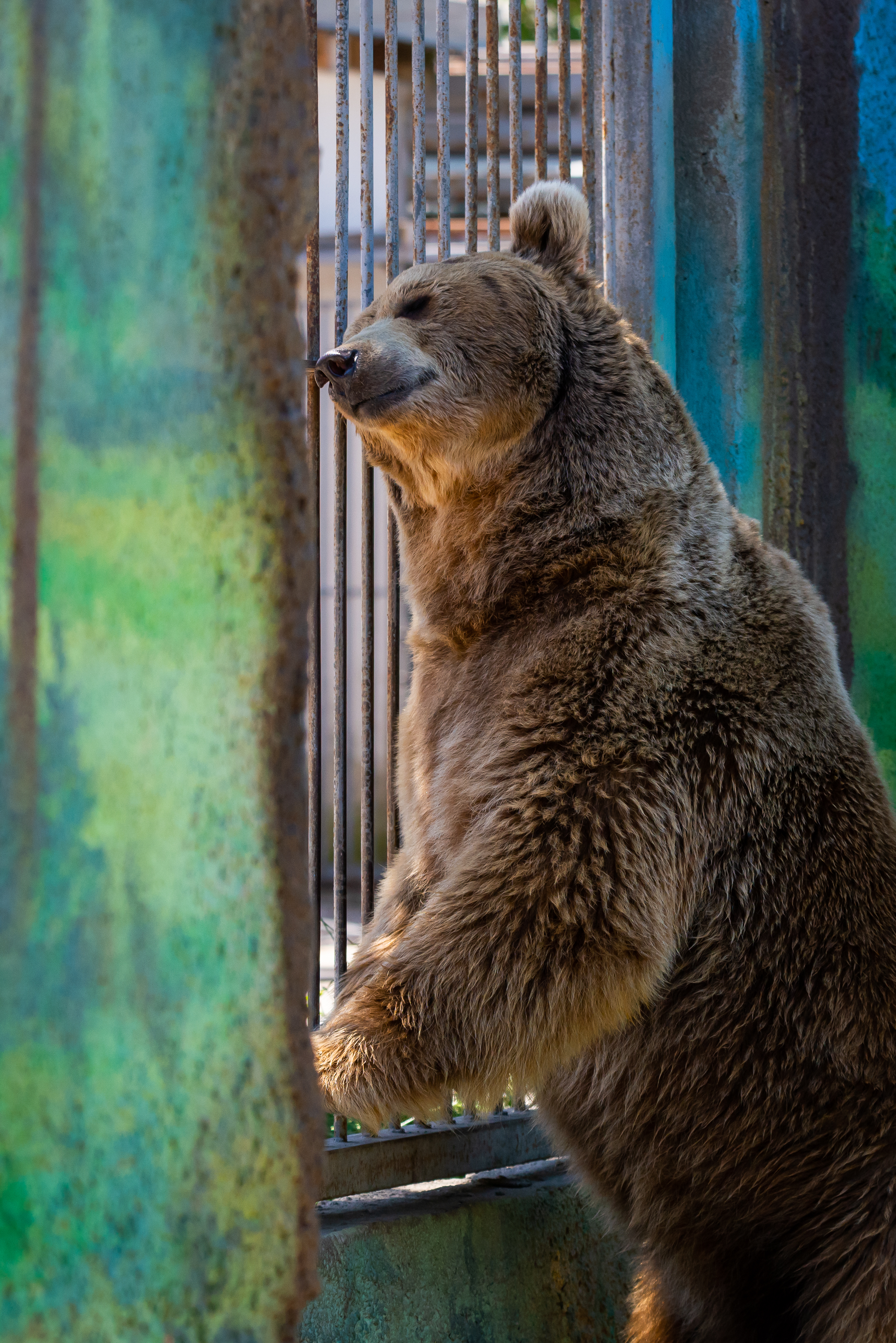 This photograph captures a moment of profound contemplation by a brown bear within its zoo enclosure. Sunlight gently illuminates its thick, brown fur, highlighting each strand and giving the image a sense of depth. The bear stands on its hind legs, resting its front paws on the metal bars that separate it from the outside world. Its eyes are half-closed, and its head is tilted slightly, as if it is lost in thought, perhaps pondering something distant, possibly the wild nature from which it originates.