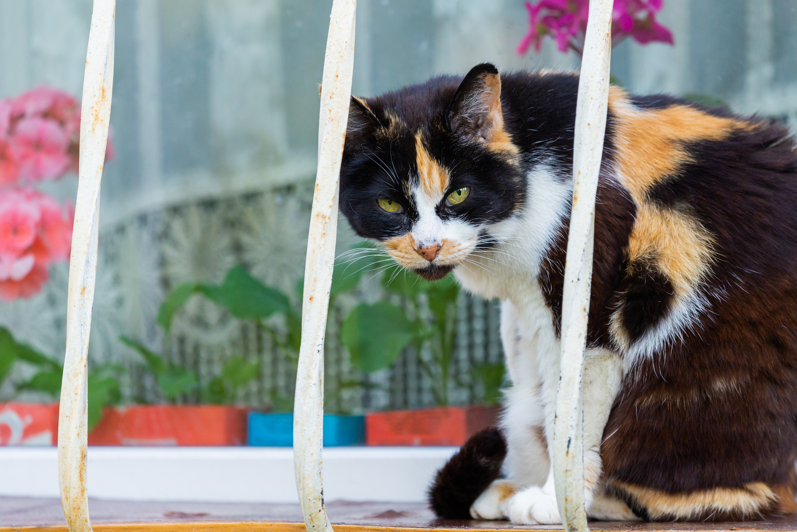 The cat is positioned behind white vertical bars, which create a sense of confinement or enclosure. This could be a balcony railing or a fence. Light falls on the cat, highlighting the texture of its fur and the expressiveness of its face. In the background, blurred pink flowers and green foliage are visible, creating a soft, picturesque backdrop that contrasts with the sharpness of the cat's image.
