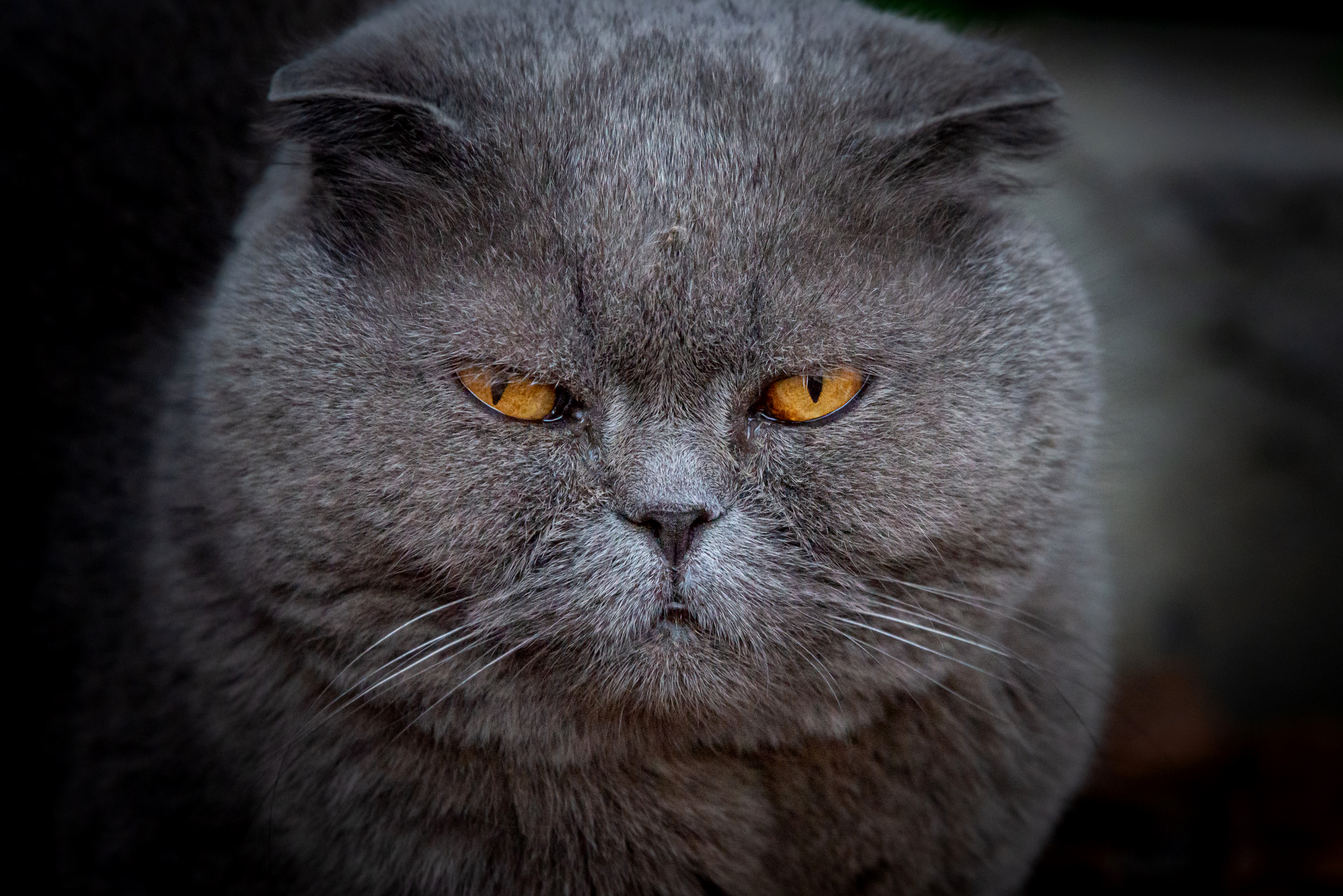 Этот завораживающий портрет крупным планом демонстрирует величественную морду британского короткошерстного кота. Его густая, плюшевая шерсть насыщенного серого оттенка обрамляет его круглую, выразительную мордочку, создавая ощущение мягкости и роскоши. Особое внимание привлекают его глубокие, пронзительные янтарные глаза, которые словно светятся изнутри, наполненные мудростью и загадочностью. Зрачки в них узкие, что придает взгляду кота интенсивность и сосредоточенность, вызывая ощущение, что он пристально наблюдает за чем-то важным.