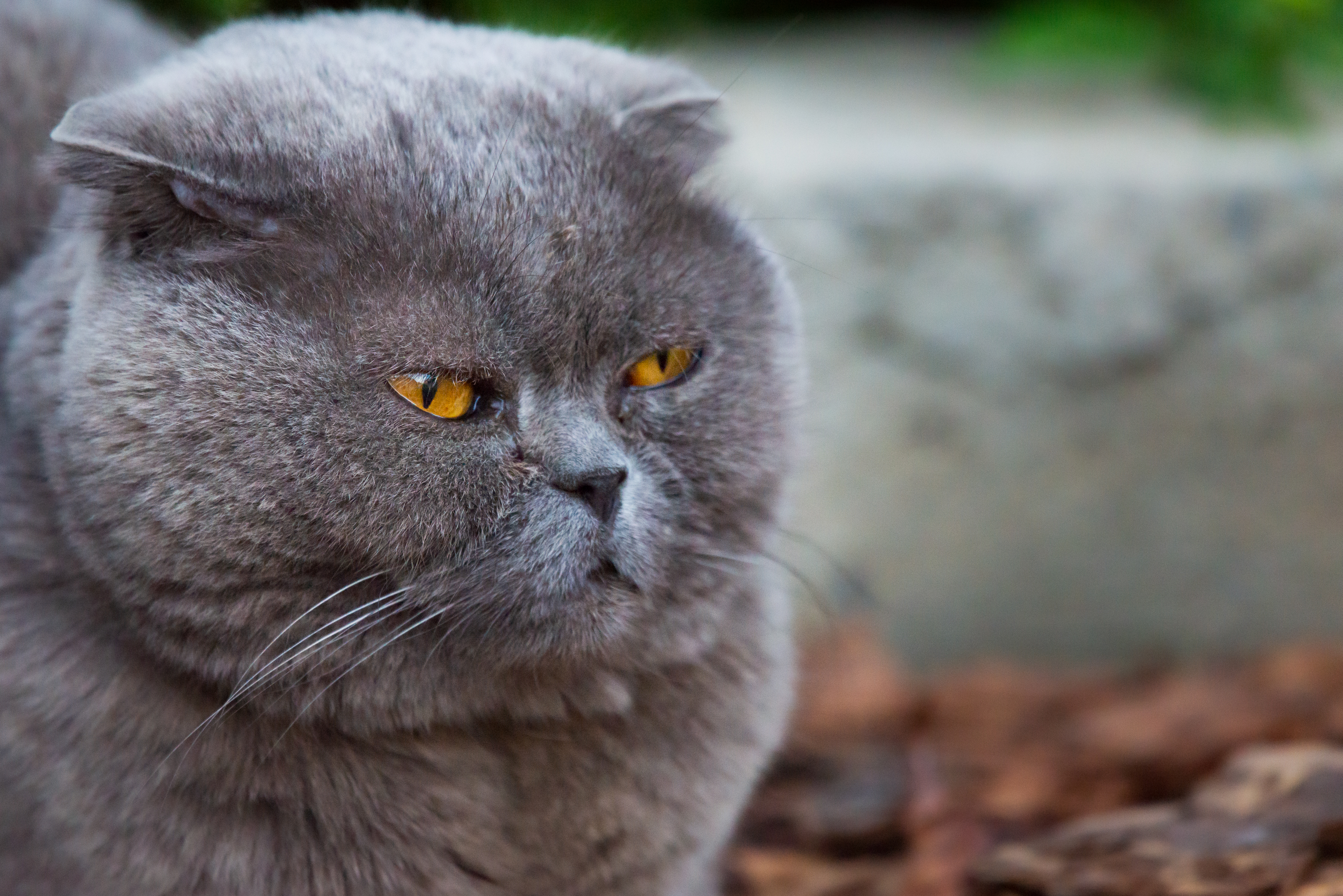 Этот завораживающий портрет представляет собой крупный план серого шотландского вислоухого кота, чьи глаза, словно два ярких янтаря, приковывают взгляд. Мягкая, густая шерсть серого окраса создает ощущение уюта и благородства, контрастируя с пронзительным взглядом. Уши, характерные для породы шотландских вислоухих, аккуратно прижаты, придавая мордочке уникальное выражение.