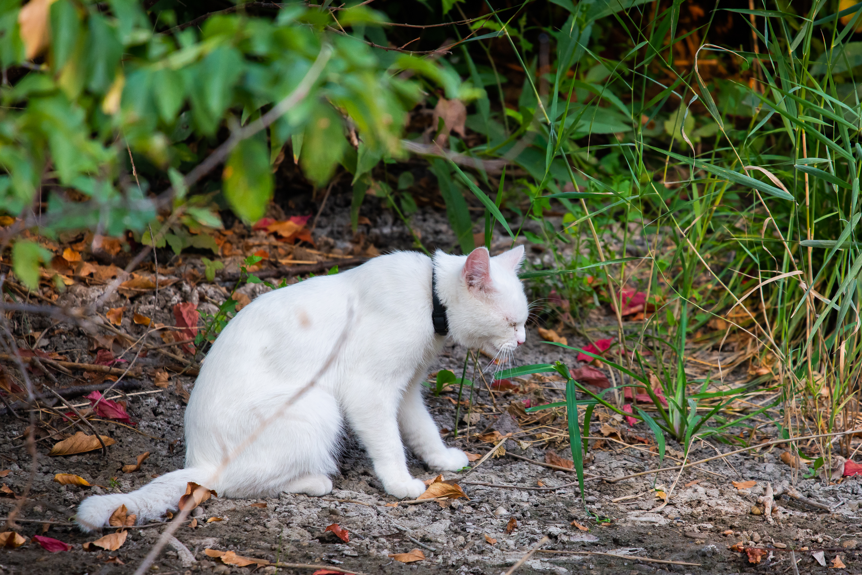 This shot captures a moment of solitude and exploration of the wild by a white cat. The fluffy pet, adorned with a black collar, is bent low to the ground, its gaze intently focused on something elusive in the grass. Its snow-white fur contrasts with the dark hues of the soil and fallen autumn leaves, creating a picturesque scene.