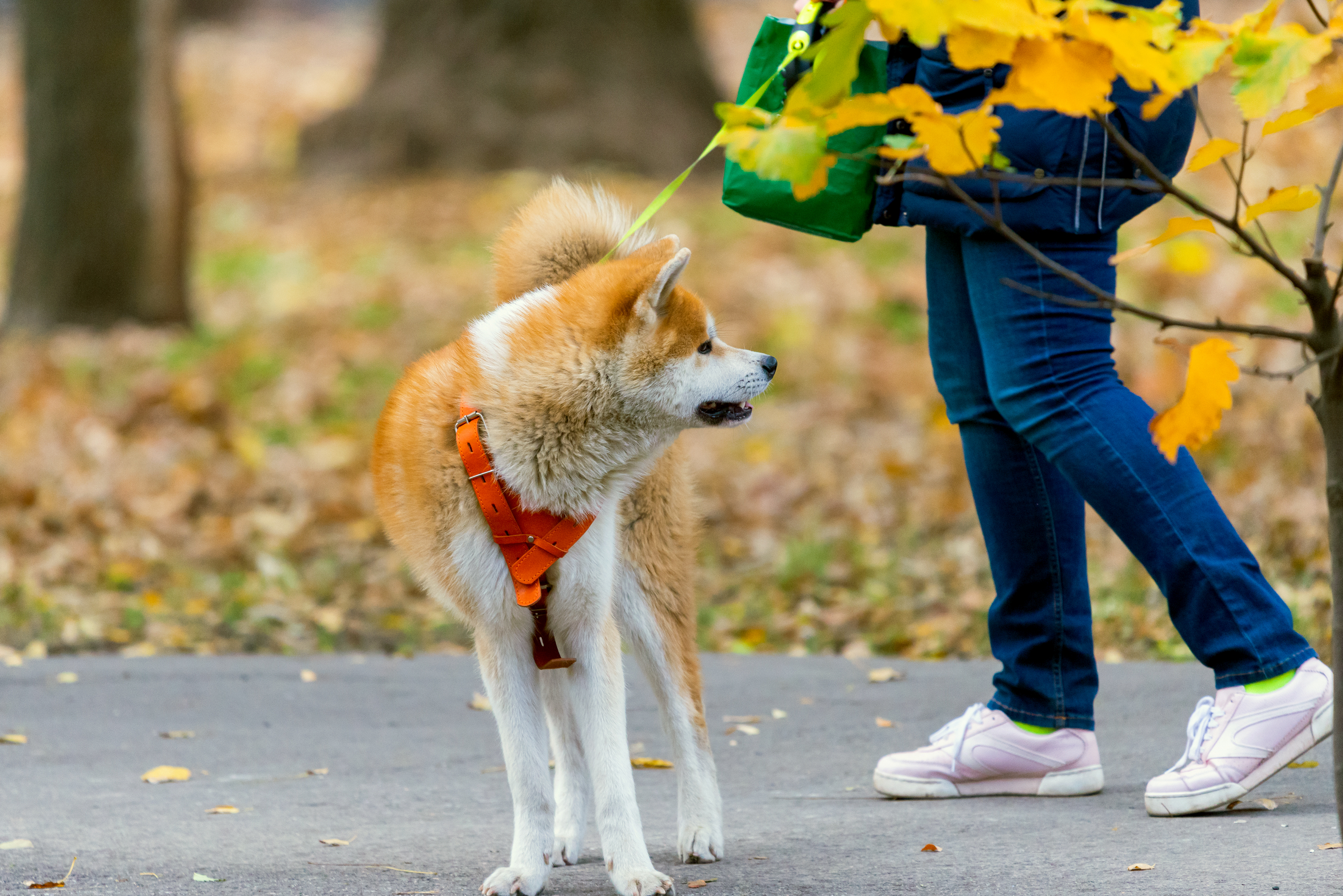 Акита-ину на прогулке осенью в парке
