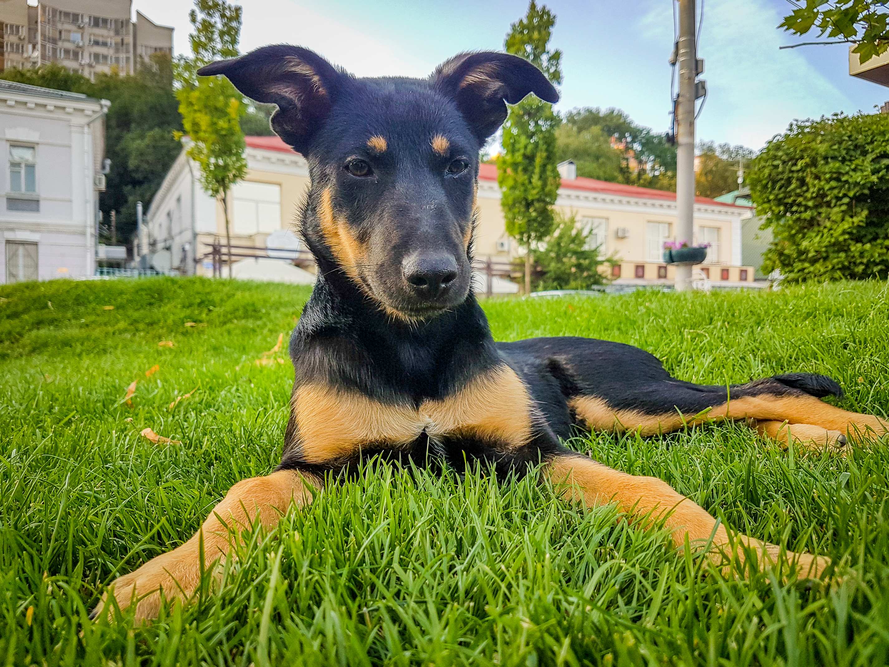 Этот очаровательный снимок запечатлел милого щенка, который расслабленно лежит на ярко-зеленой, густой траве. Солнечный свет мягко освещает его шерсть, подчеркивая контраст между темными и рыжими оттенками. Большие, выразительные уши щенка настороженно приподняты, а взгляд его умных глаз направлен прямо в камеру, создавая ощущение прямой связи со зрителем.