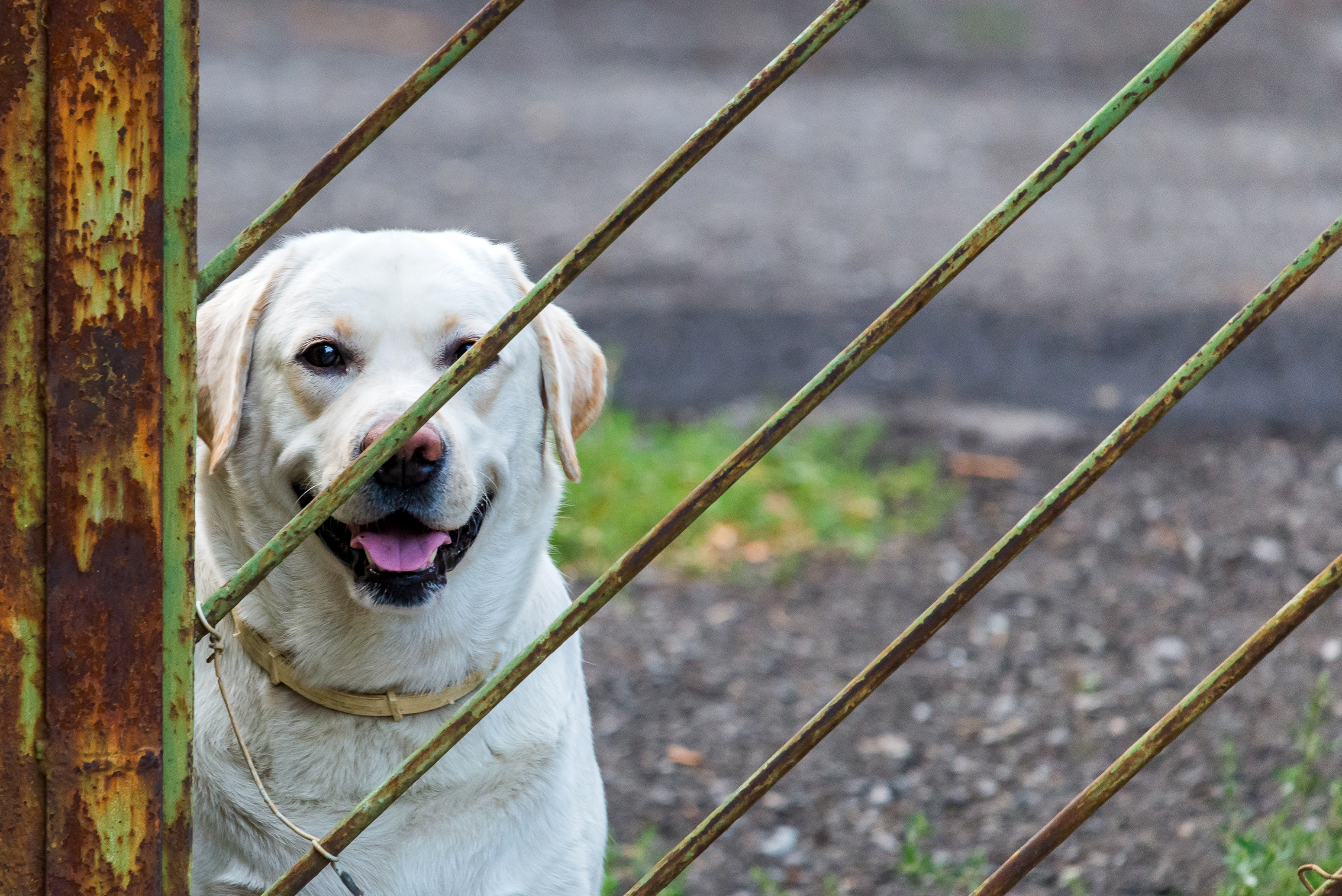 Фон размыт, но можно различить серый гравий и зеленую траву, что намекает на улицу или двор. Цветовая палитра изображения приглушенная, с преобладанием теплых коричневых и зеленых оттенков ржавчины на ограде, контрастирующих с мягким белым цветом шерсти лабрадора. Естественное освещение подчеркивает текстуру шерсти и детали морды собаки. Композиция снимка фокусируется на лице животного, передавая его эмоции и создавая ощущение личного контакта со зрителем. Этот кадр прекрасно передает дух верного друга, ожидающего встречи или приветствующего проходящих мимо.
