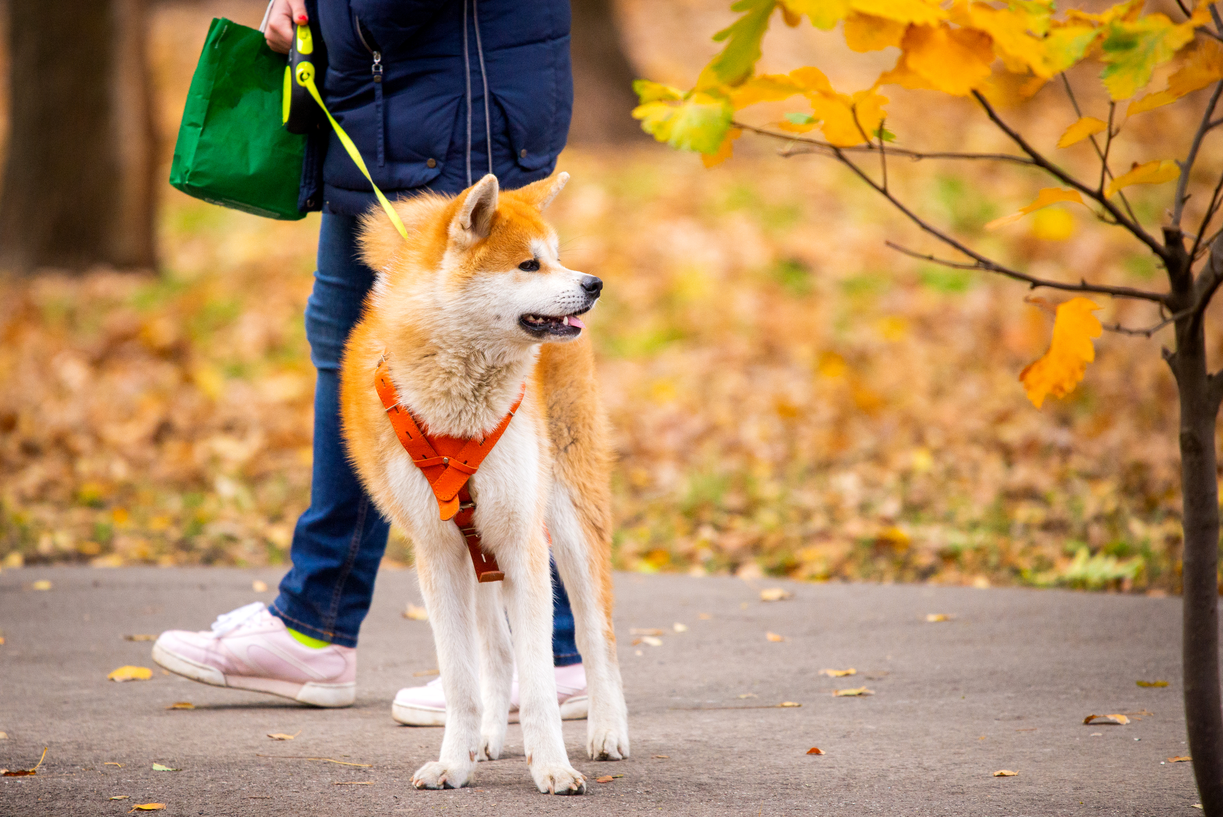 Этот снимок запечатлел очаровательный момент осенней прогулки в парке, где в центре внимания – величественный пес породы Акита-ину. Его густая рыже-белая шерсть ярко контрастирует с оранжевой шлейкой, подчеркивая его благородную осанку. Пес стоит на асфальтированной дорожке, усыпанной опавшими листьями, которые создают живописный фон.