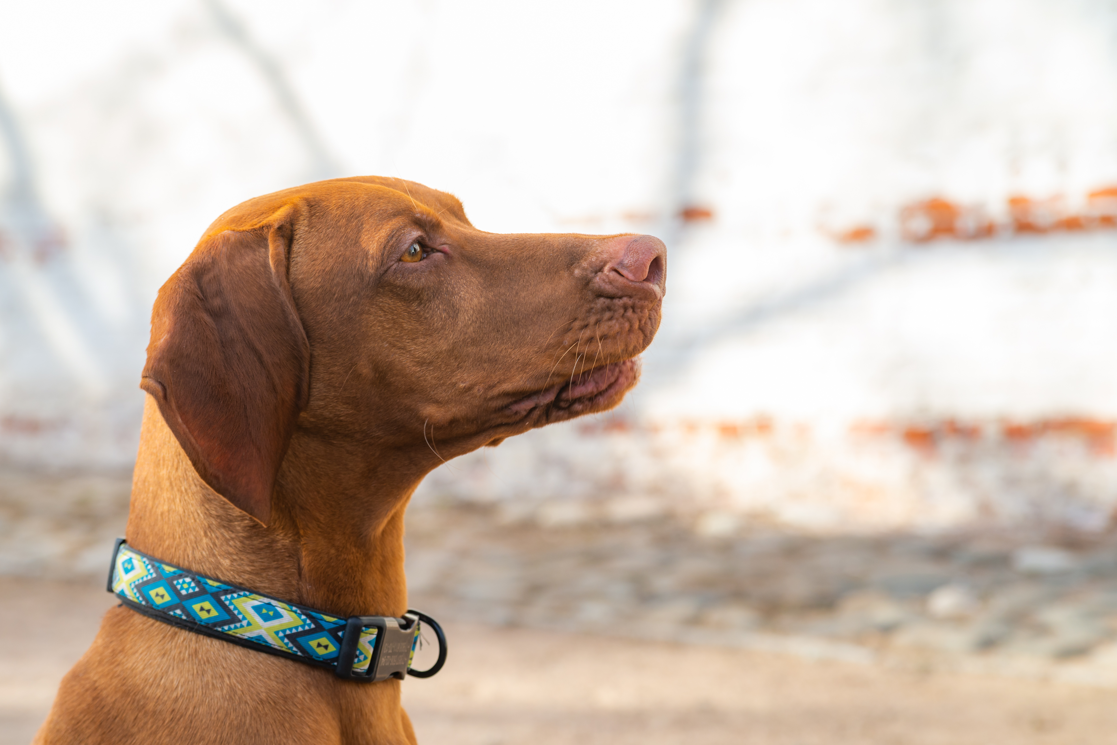 The dog wears a vibrant, modern collar around its neck, adorned with a geometric pattern of blue, turquoise, and green diamonds. This stylish accessory adds a touch of personality to the dog's appearance and highlights its well-groomed nature. The collar appears sturdy and comfortable, suggesting attentive care from its owner.