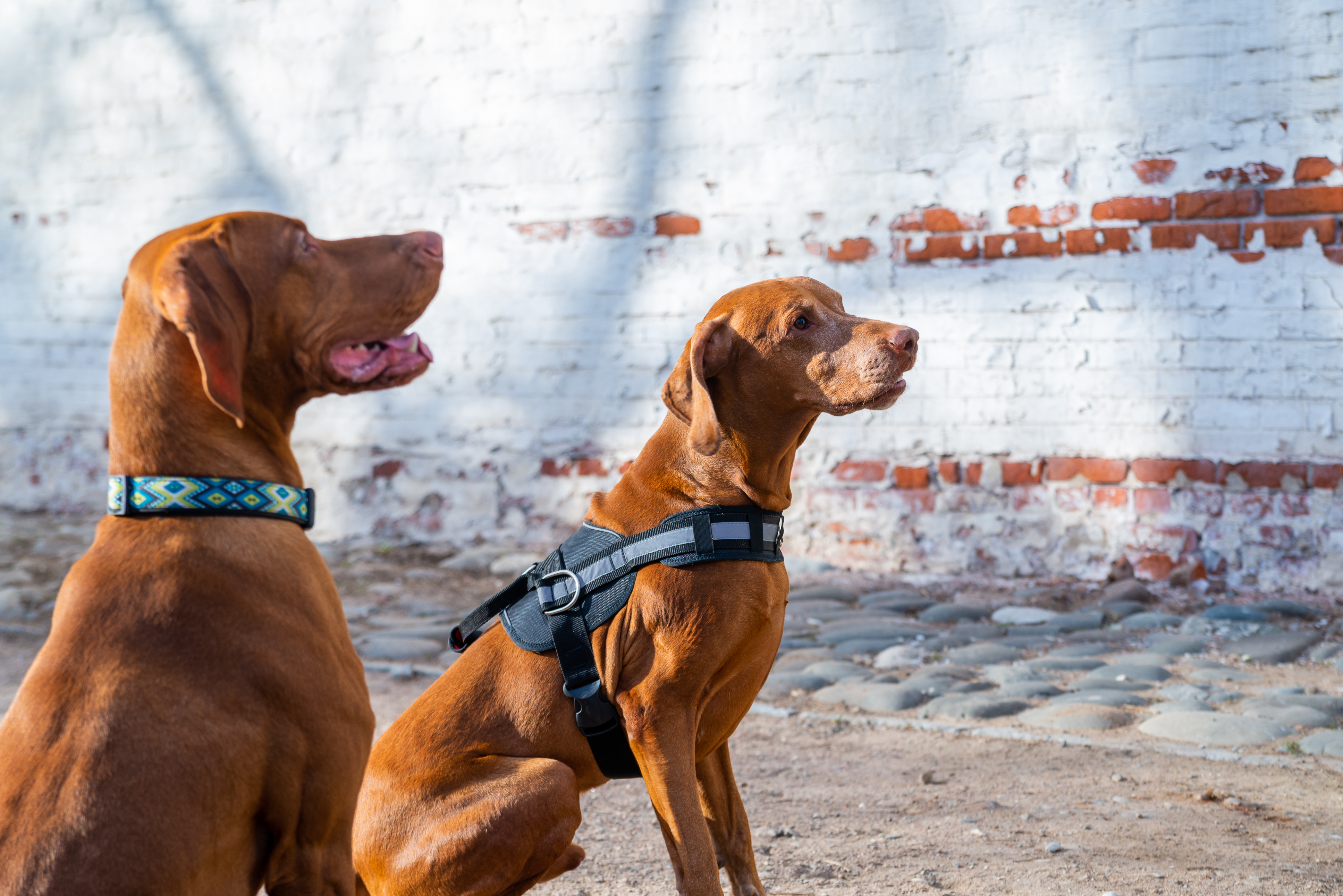 Фоном служит старая, обшарпанная кирпичная стена, местами покрытая белой краской, которая отслаивается, обнажая рыжие кирпичи. Такая текстура добавляет изображению глубины и характера. Под ногами собак — земля, смешанная с мелкими камнями, создавая ощущение уличной или парковой обстановки. Солнечный свет играет на шерсти собак и создает игру теней на стене, придавая сцене живость и естественность.