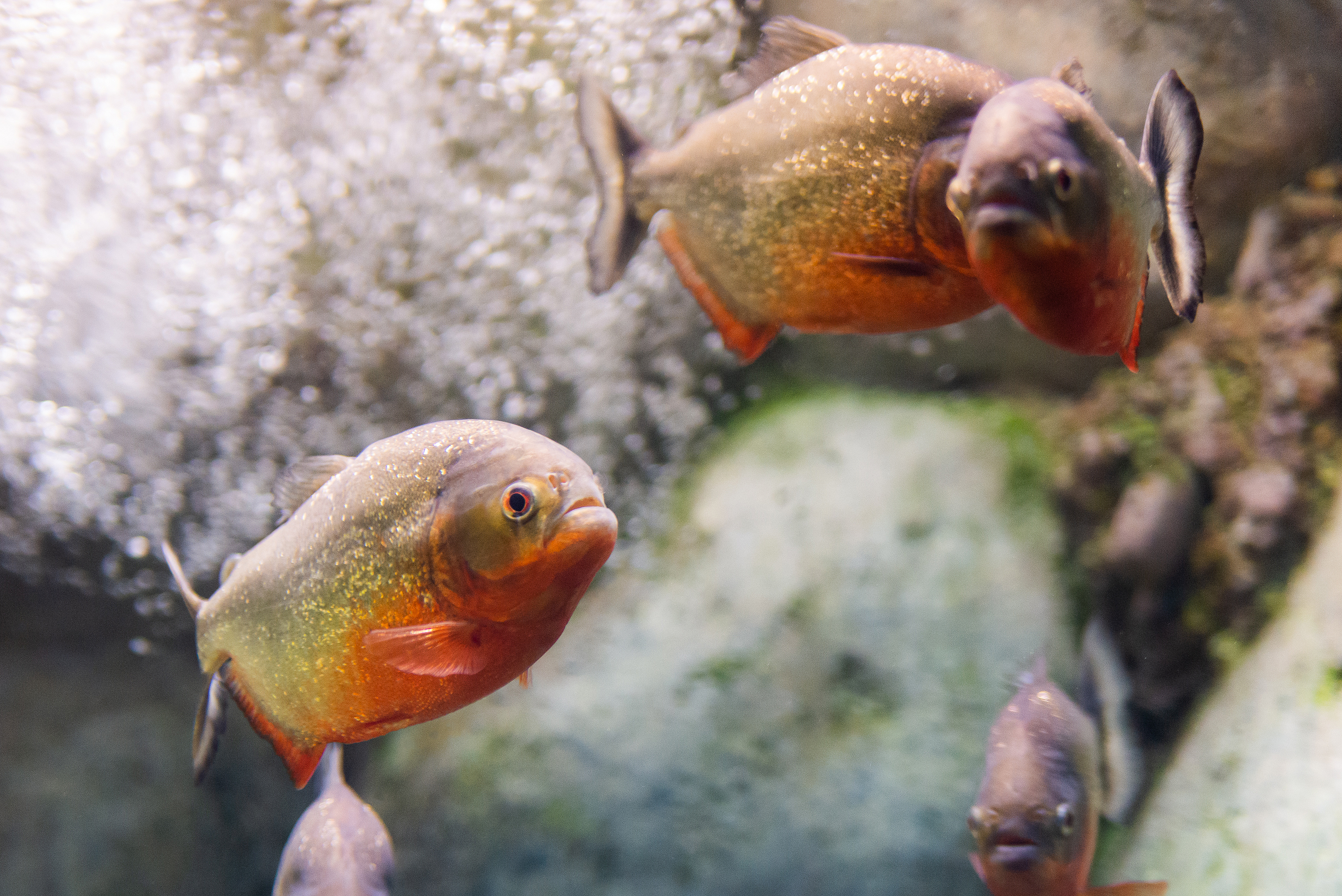 На заднем плане видны силуэты других пираний, а также мутная, пузырящаяся вода, создающая атмосферу глубины и таинственности. Текстура камней и зелени на дне аквариума размыта, что позволяет сосредоточить все внимание на рыбах.