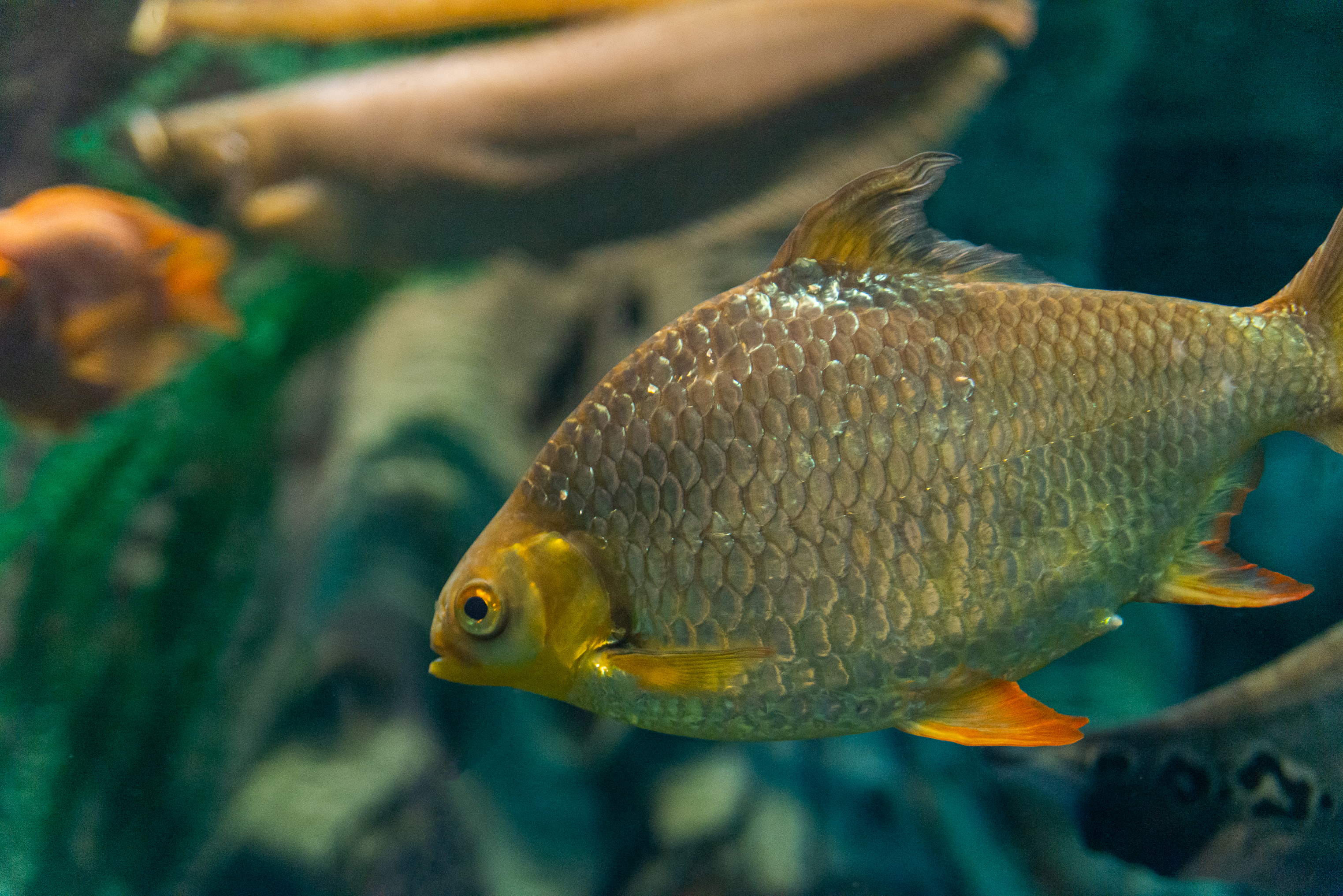This image presents a detailed close-up of a goldfish swimming in an aquarium. The primary focus is on the fish, which occupies the central part of the frame. Its scales shimmer with golden and bronze hues, each scale clearly visible, creating a textured pattern.