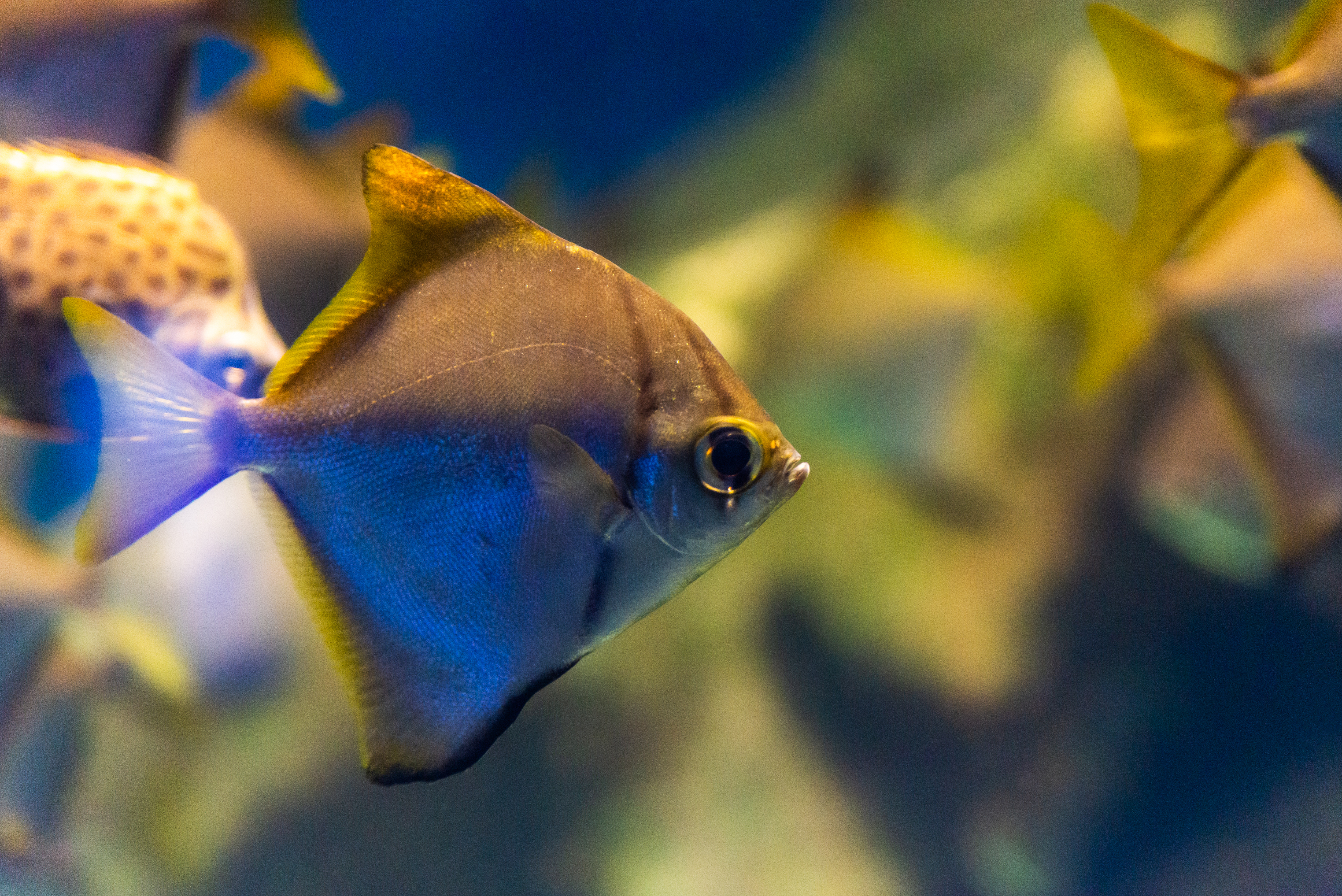 Moneta fish in aquarium: golden-blue shimmer of the underwater world