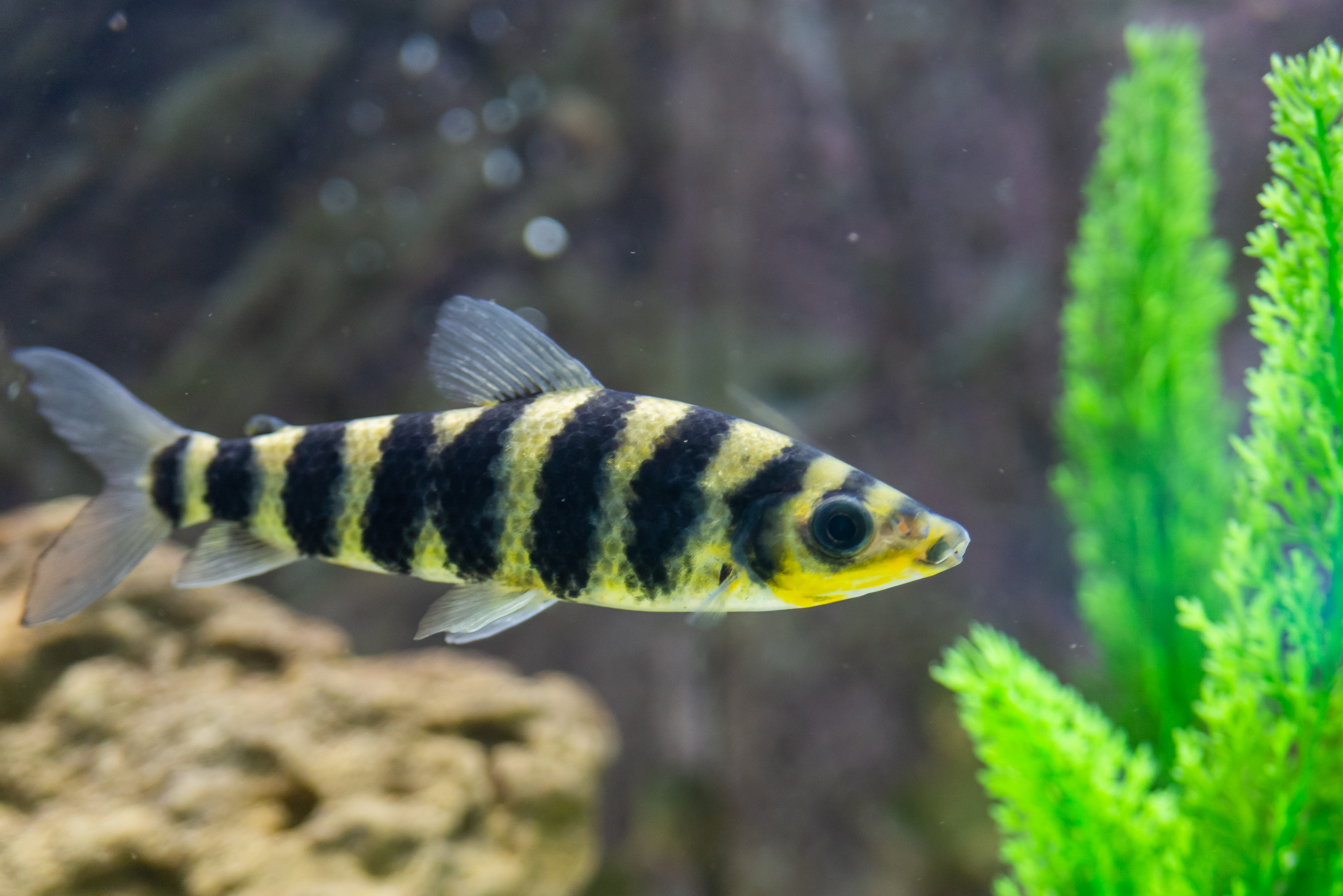 Этот снимок переносит зрителя в подводный мир аквариума, где царствует красочная рыбка. Главным героем изображения является барбус суматранский, известный своими характерными черно-желтыми полосами, которые придают ему уникальный и узнаваемый вид. Рыбка изображена в профиль, ее тело слегка наклонено, что подчеркивает грациозность ее движений. Яркий желтый окрас головы контрастирует с темными полосами, создавая завораживающий узор. Глаза рыбки черные и блестящие, внимательно смотрящие вперед, словно она исследует окружающее пространство.