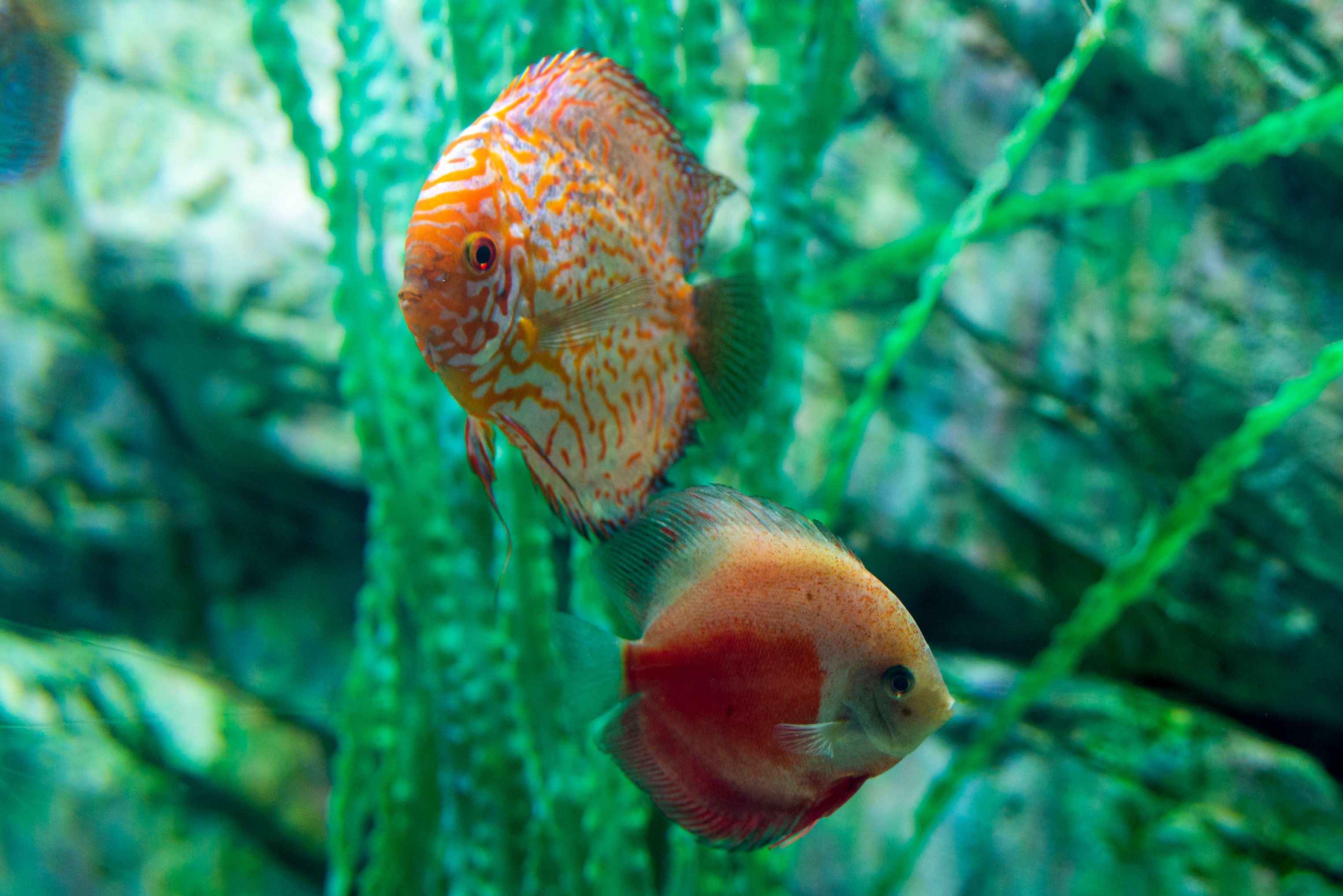 This mesmerizing image immerses the viewer into the underwater world of an aquarium, where two magnificent discus fish take center stage. The upper fish, colored in an intense orange, is adorned with an intricate pattern of white and cream stripes, resembling abstract art. Its body is almost perfectly round, and its fins are neatly spread, emphasizing the elegance of its form. The fish's eyes are dark and expressive, looking directly at the viewer, creating a sense of connection.