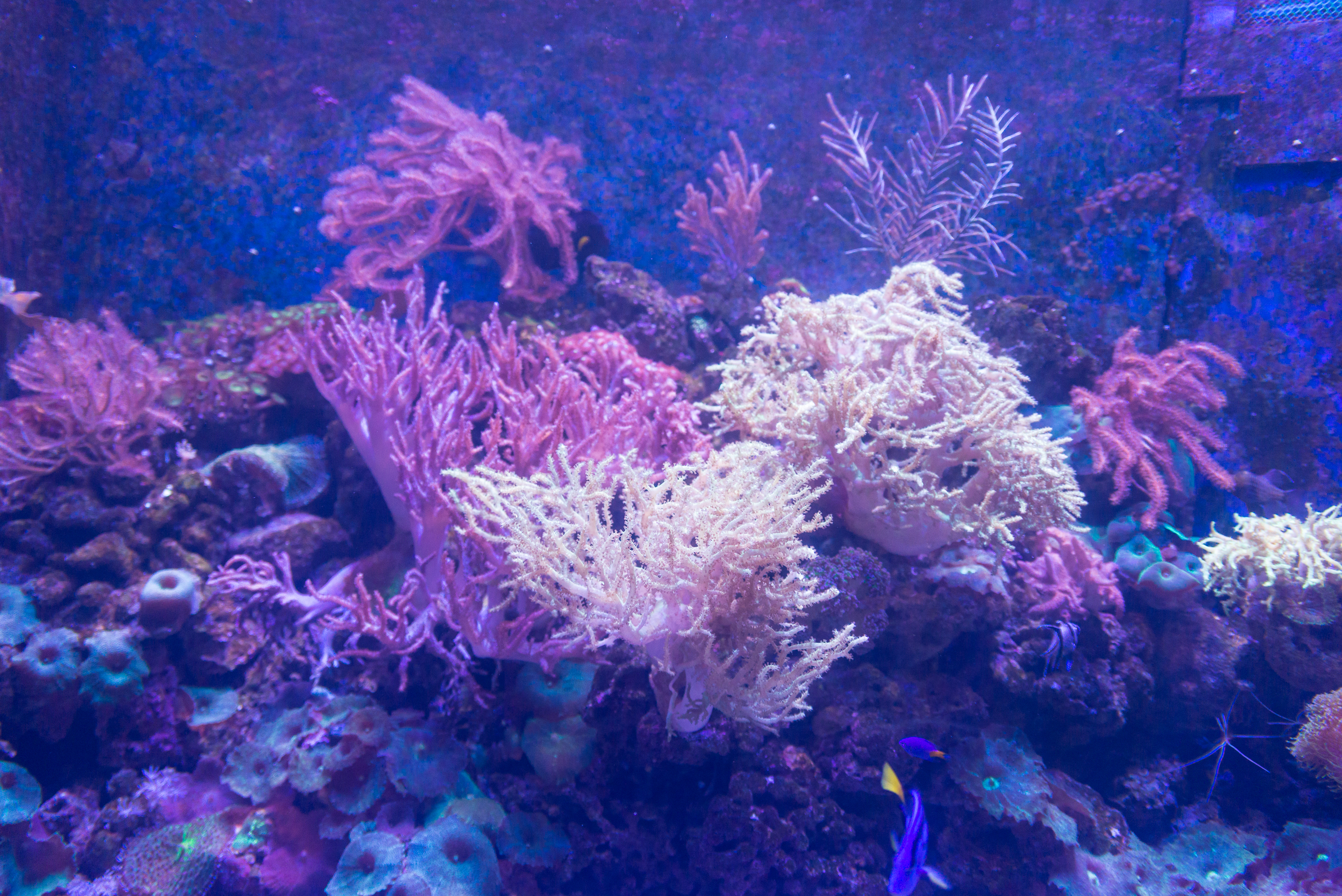 The primary focus is on the diversity of corals: from delicate, branching structures of pale cream color, resembling lace, to denser, purple-pink corals that create volume and texture. Their shapes are varied – some resemble trees, others peculiar bushes, and still others fine, elegant branches reaching towards the light.