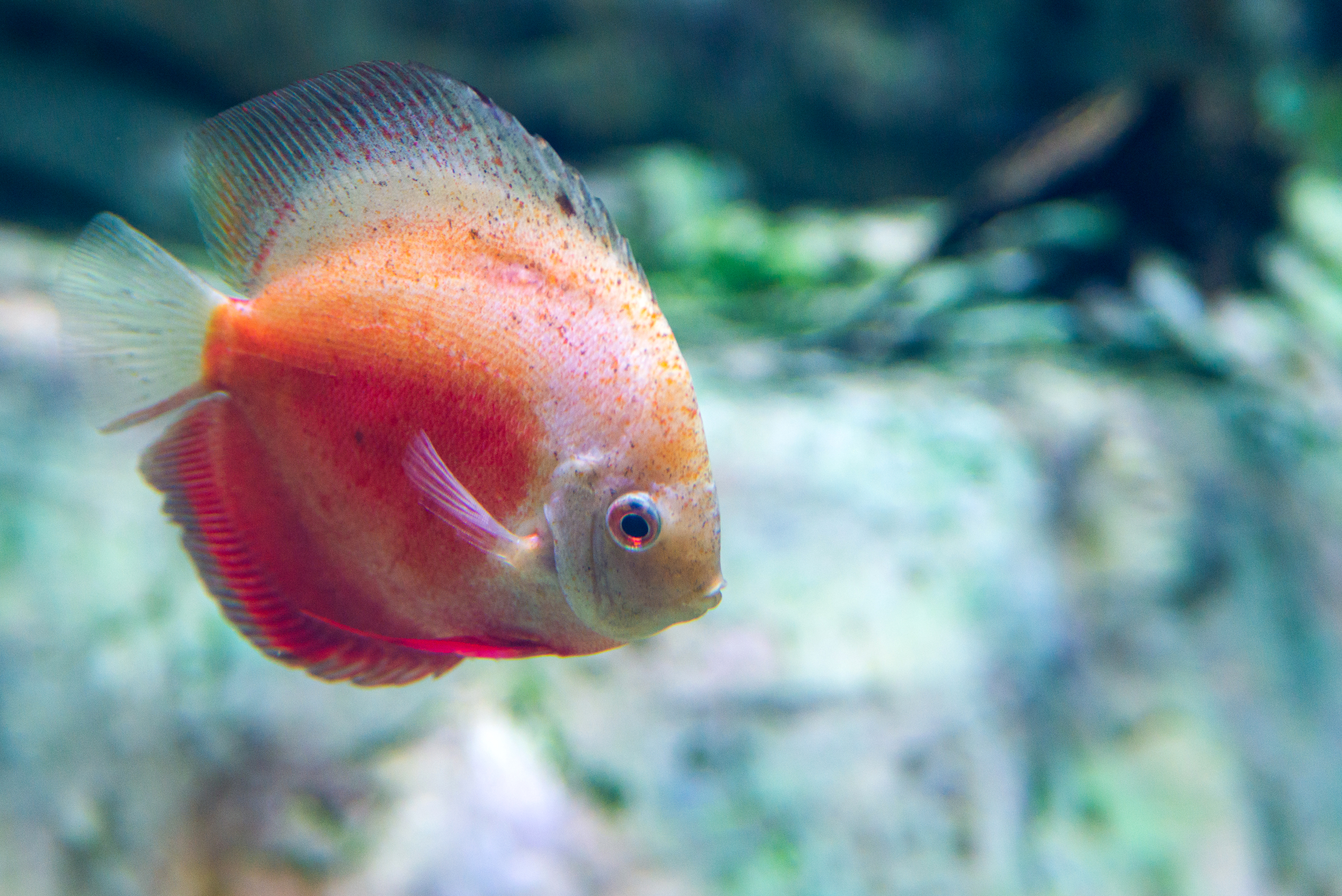 Этот захватывающий снимок крупным планом демонстрирует красоту и изящество рыбы-диск, плавающей в аквариуме. Яркий оранжево-красный окрас рыбы контрастирует с мягким, размытым фоном, состоящим из зелени и камней, что создает ощущение глубины и спокойствия. Детали чешуи, плавников и выразительные глаза рыбы подчеркнуты благодаря фокусу, позволяя зрителю оценить каждую черточку этого удивительного водного обитателя.