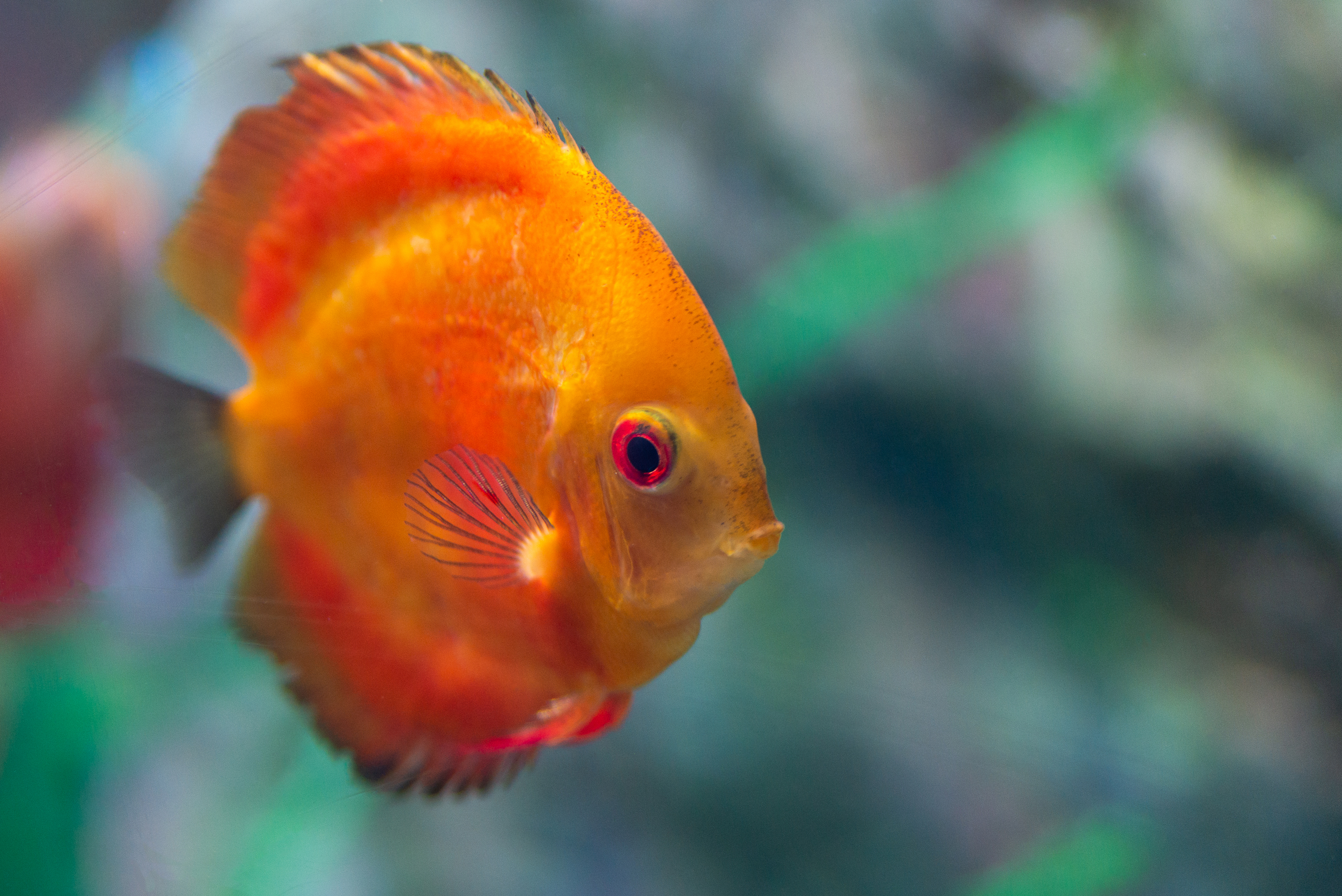 This captivating image is a close-up of a magnificent orange discus fish, captured in its natural habitat – an aquarium. The vibrant, rich orange color of the fish's body dominates the frame, creating a sense of warmth and liveliness. Subtle darker orange stripes accentuate its disc-like shape, adding depth and texture.