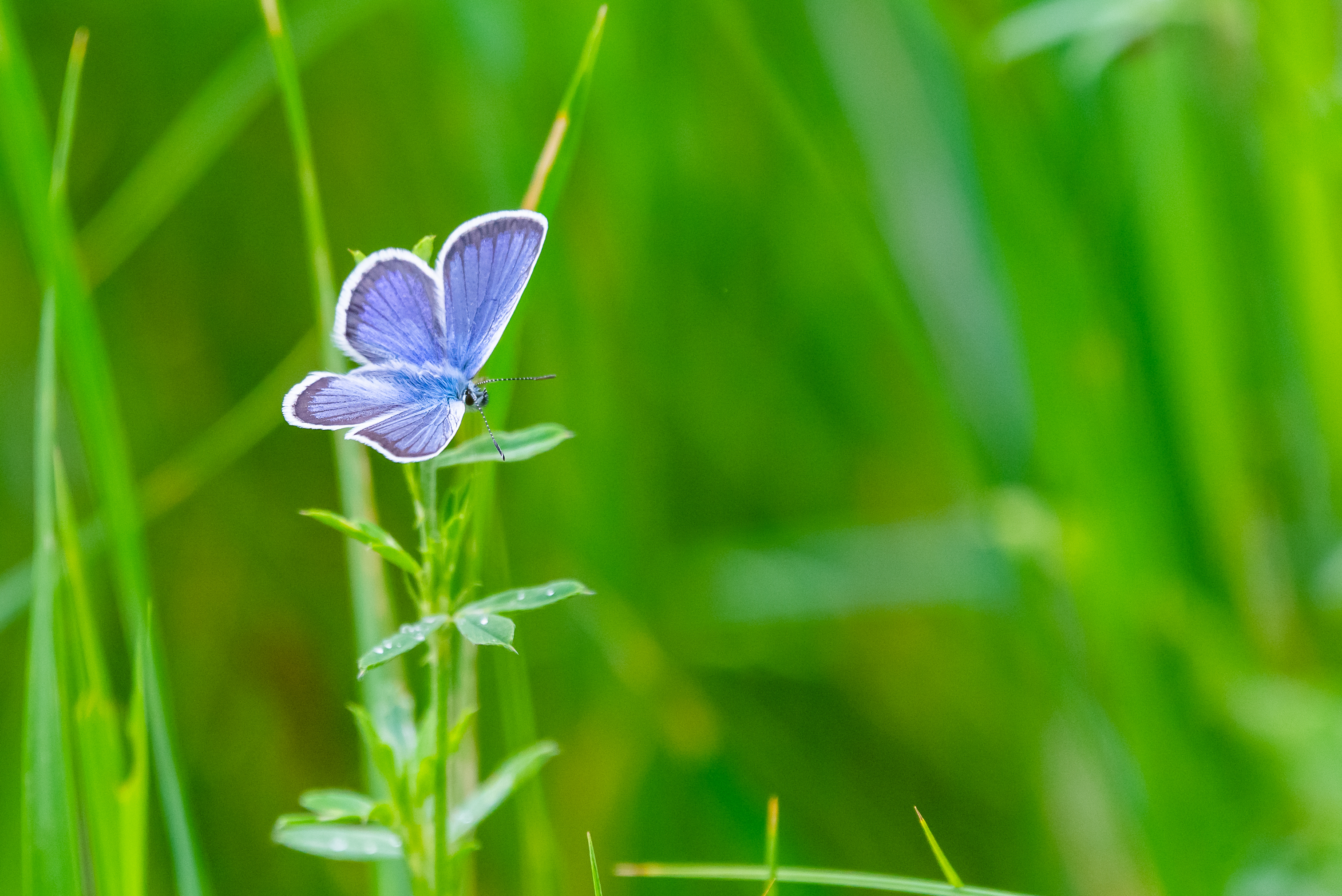 Это изображение передает утонченную красоту природы, запечатлевая момент покоя и изящества. В центре композиции — крошечная синяя бабочка, ее крылья, окрашенные в небесно-голубой оттенок с тонкой белой каймой, изящно распахнуты. Она сидит на нежном зеленом растении, чьи листья украшены мелкими каплями росы, намекая на свежесть утра или недавний дождь.