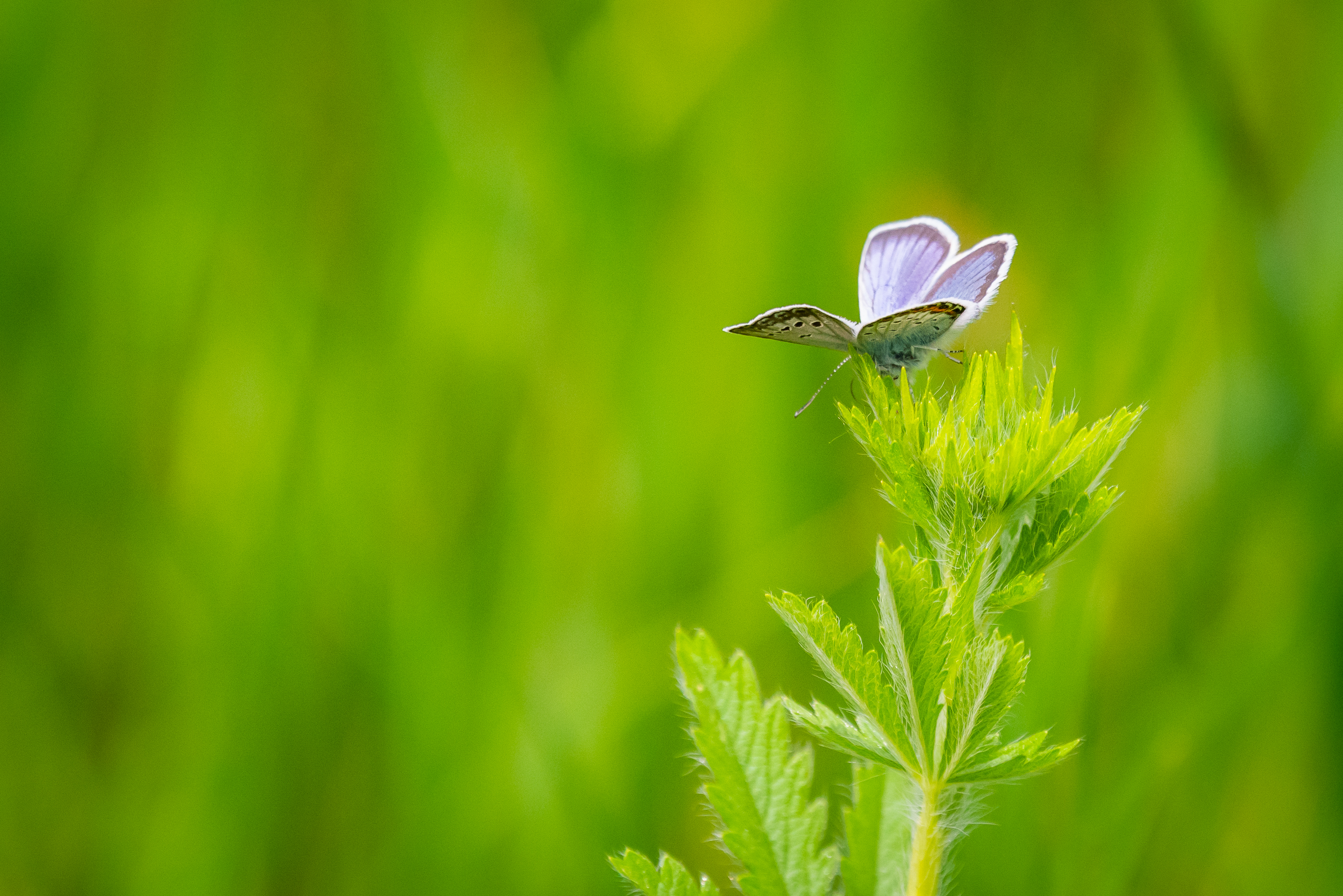 The composition of the photograph focuses on this miniature creature, placing it in the right part of the frame. The left part of the image presents a blurred background of vibrant greenery, creating a sense of depth and highlighting the butterfly's fragility. The play of light and shadow on the plant's leaves adds volume and liveliness to the image. The color palette consists mainly of various shades of green, from bright lime to deep emerald, contrasting with the gentle blue of the butterfly.