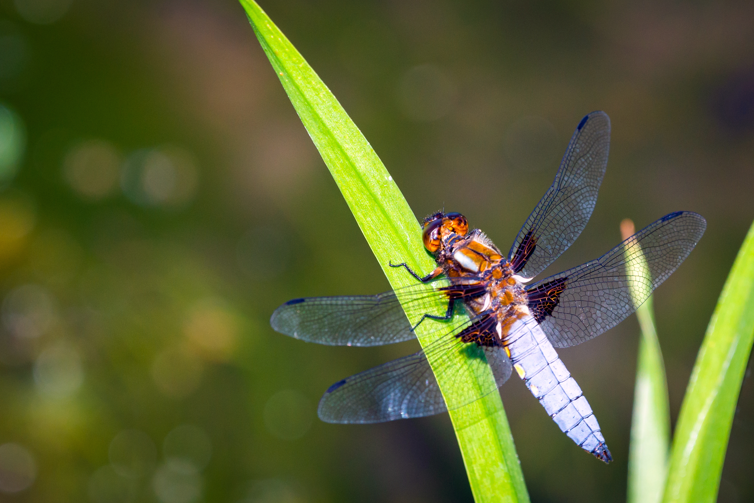 This captivating macro photograph showcases a stunning dragonfly at rest on a vibrant, lush green leaf. Sunlight filters through the insect's translucent wings, highlighting their delicate, intricate texture and veining. The dragonfly's body displays a rich palette of browns, oranges, and whites, with distinct dark patterns adding complexity to its appearance. Its bluish-grey segmented abdomen contrasts with its darker thorax and bright head, featuring large, expressive compound eyes that seem to observe the world around it.