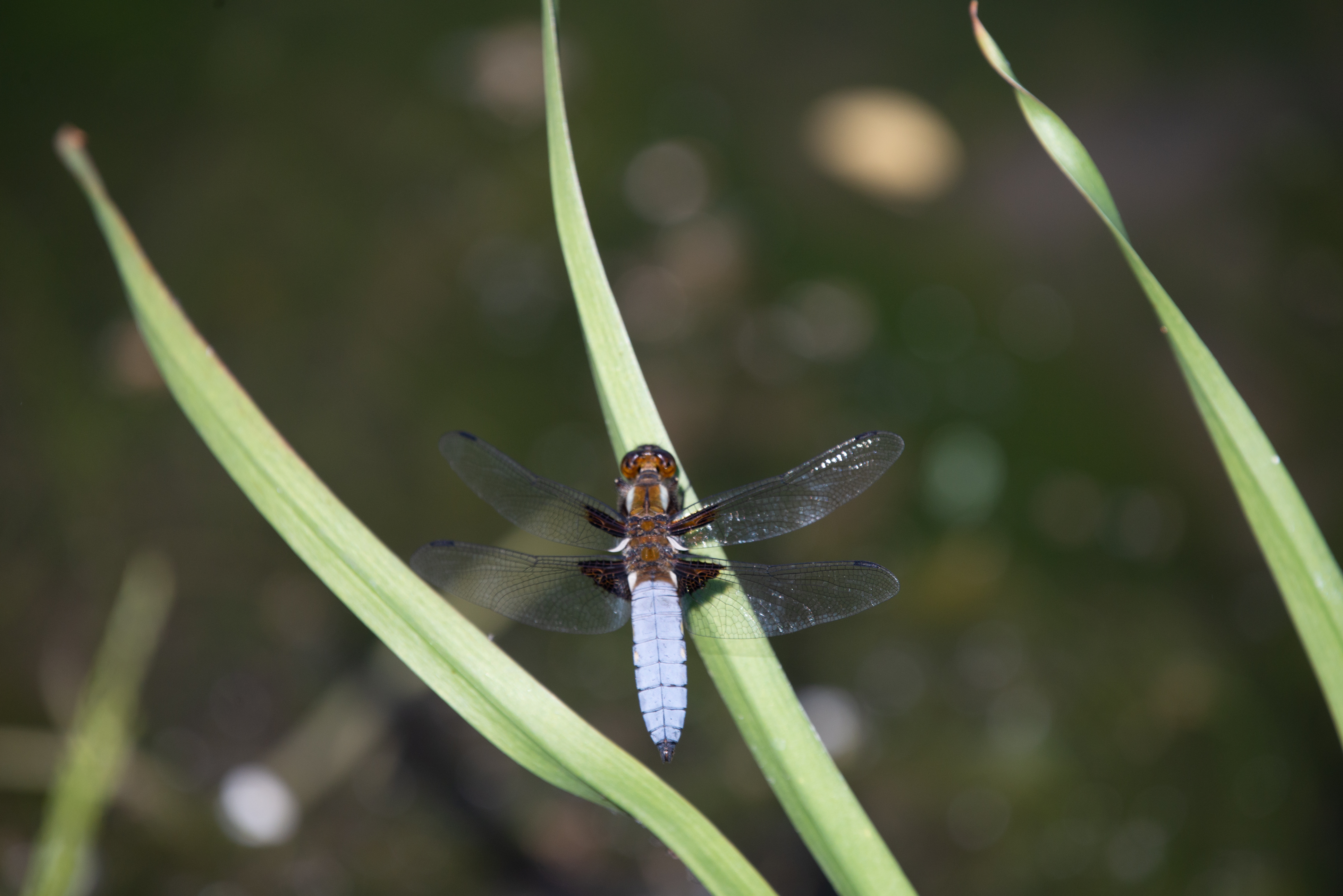 Изображение запечатлело момент спокойствия в мире природы, где изящная стрекоза нашла приют на сочном зеленом листе. Эта стрекоза, вероятно, вида Libellula depressa (широкоформатная стрекоза), выделяется своим ярким, насыщенным синим брюшком, контрастирующим с темно-коричневым телом и головой. Ее прозрачные, переливчатые крылья, украшенные тонкой сеткой прожилок, расправлены, демонстрируя их хрупкую красоту.