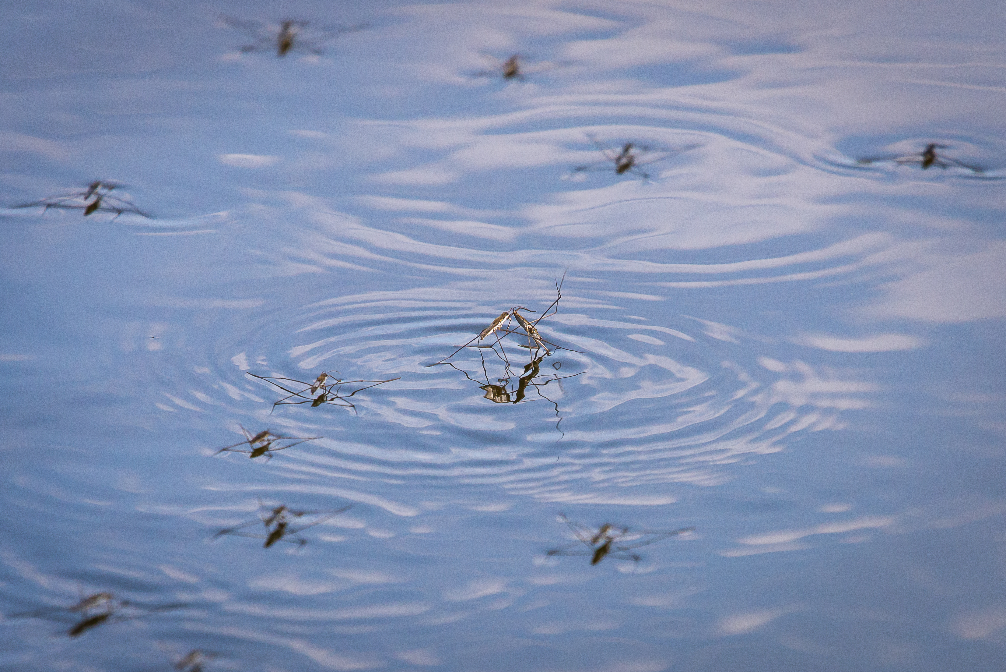 Композиция снимка построена вокруг центрального элемента – воды и комаров. Фокусная точка находится на нескольких насекомых в центре кадра, что позволяет детально рассмотреть их структуру. Цветовая палитра ограничена голубыми, серыми и коричневыми оттенками, которые подчеркивают природную гамму. Освещение равномерное, без резких теней, что создает мягкую и спокойную атмосферу. Текстура воды слегка рябая из-за небольших волн, а комары выглядят как темные силуэты.
