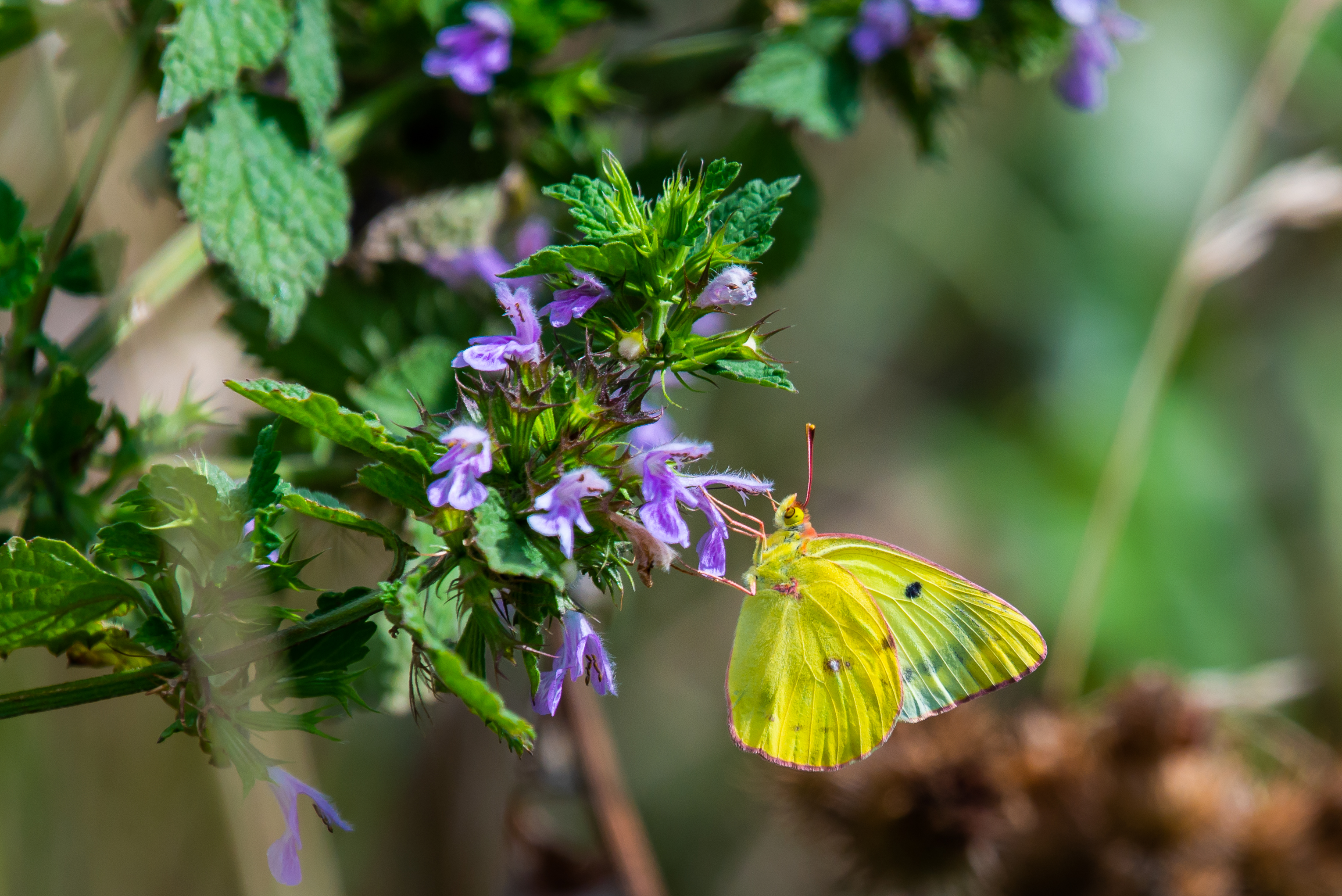 Эта фотография передает красоту и хрупкость летней природы. В центре внимания — изящная желтая бабочка, чьи крылья нежно окрашены в яркие солнечные оттенки. Она расположилась на соцветии мелких, но выразительных сиреневых цветов, демонстрируя идеальную гармонию цветов.