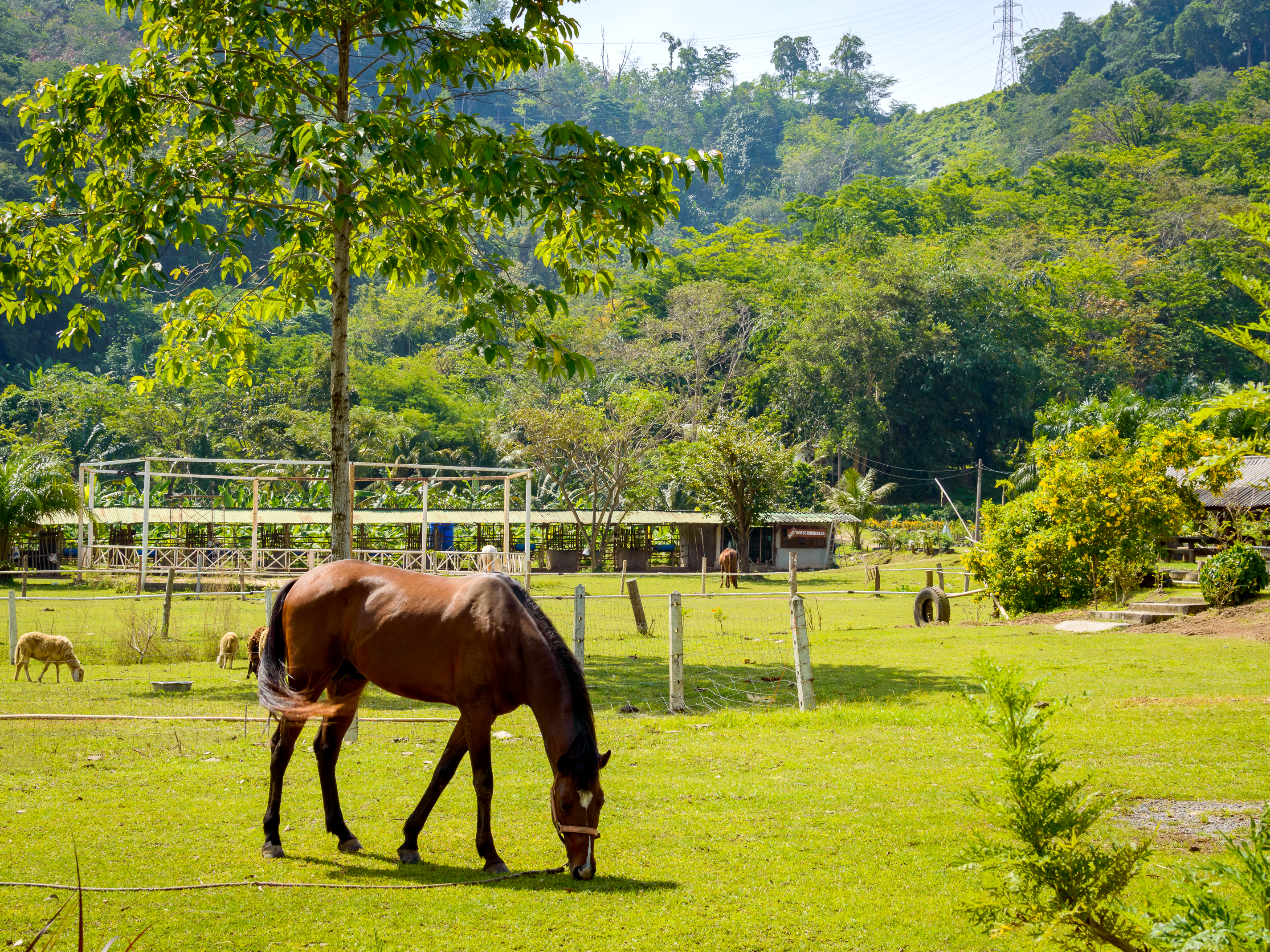 Небо чистое, голубое, с редкими белыми облаками, что говорит о прекрасной погоде. Композиция кадра сбалансирована: передний план с травой и конем, средний план с постройками и другими животными, и задний план с величественными холмами и лесами. Общее настроение изображения — спокойствие, гармония с природой и сельская идиллия. Этот снимок идеально подойдет для иллюстрации тем, связанных с природой, сельским хозяйством, животными и отдыхом на природе.