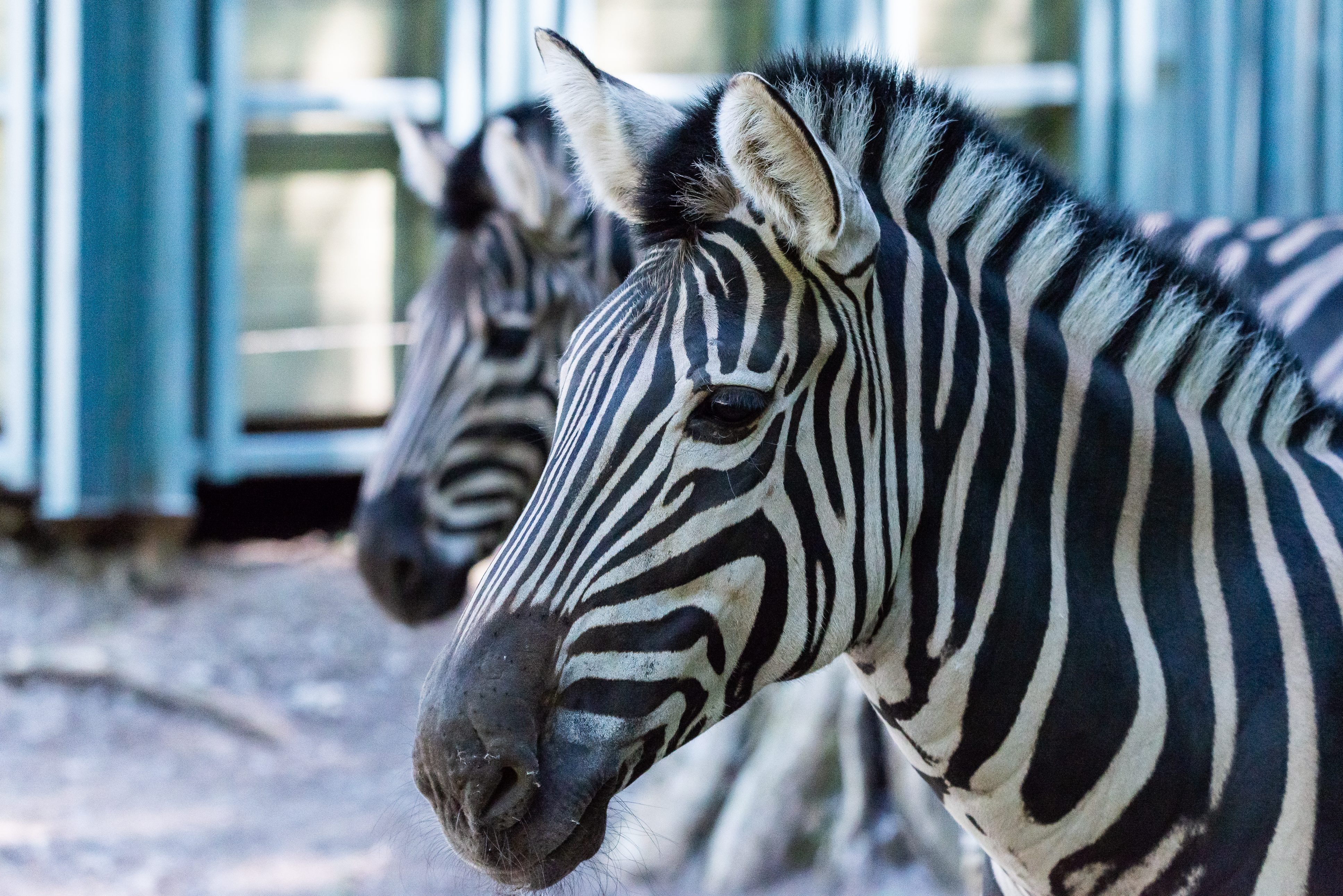 На заднем плане, в мягком фокусе, видна другая зебра, ее голова также обращена в сторону, но немного дальше от объектива. Это создает ощущение глубины и показывает, что животные находятся в естественной среде обитания, возможно, в зоопарке или заповеднике. Фон состоит из размытых серых и голубоватых оттенков, намекая на ограждение или строения, но не отвлекая от главных героев снимка.